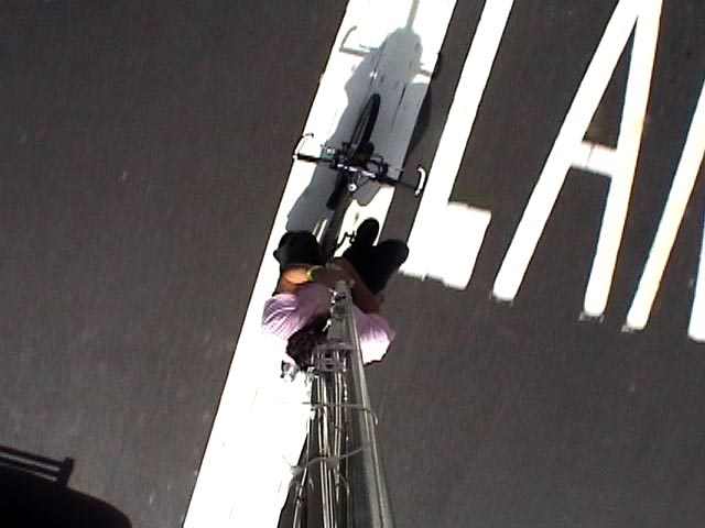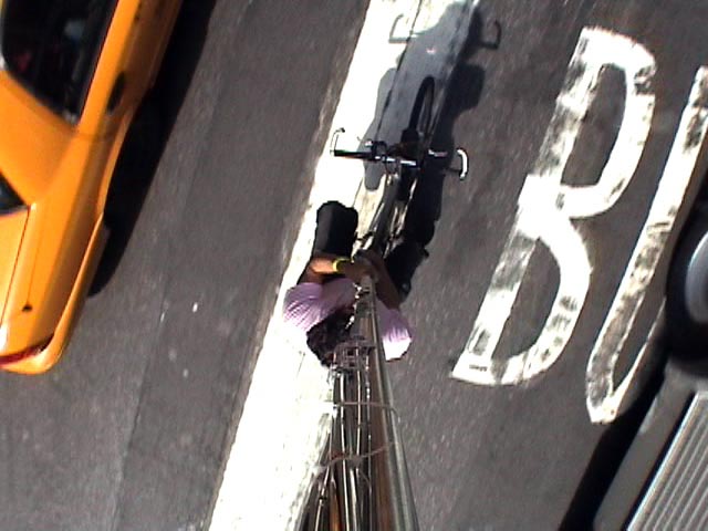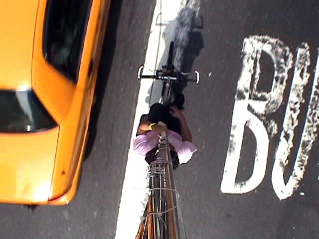 In this video I try to strictly follow the line and bicycle the bold line that divides the bus lane from the regular lanes on Madison Avenue between 42nd and 59th street, a one way street. The camera is suspended on a metal stick of about 4 meters, a rather heavy item that makes it difficult to balance while riding (with and against the traffic) mostly without holding the handlebar. This performance/video comes with a good bit of danger since the unusually heavy side wind and the heavy stick make me rather unstable confronted with the ruthless Madison Avenue Friday afternoon traffic. But due to the limited camera view the street danger is less visible than in other bicycling pieces where I also film while riding against the oncoming traffic. This creates a certain discrepancy between a rather scary bicycle/filming performance and the telescopic visual result of a flying-horse’s view.