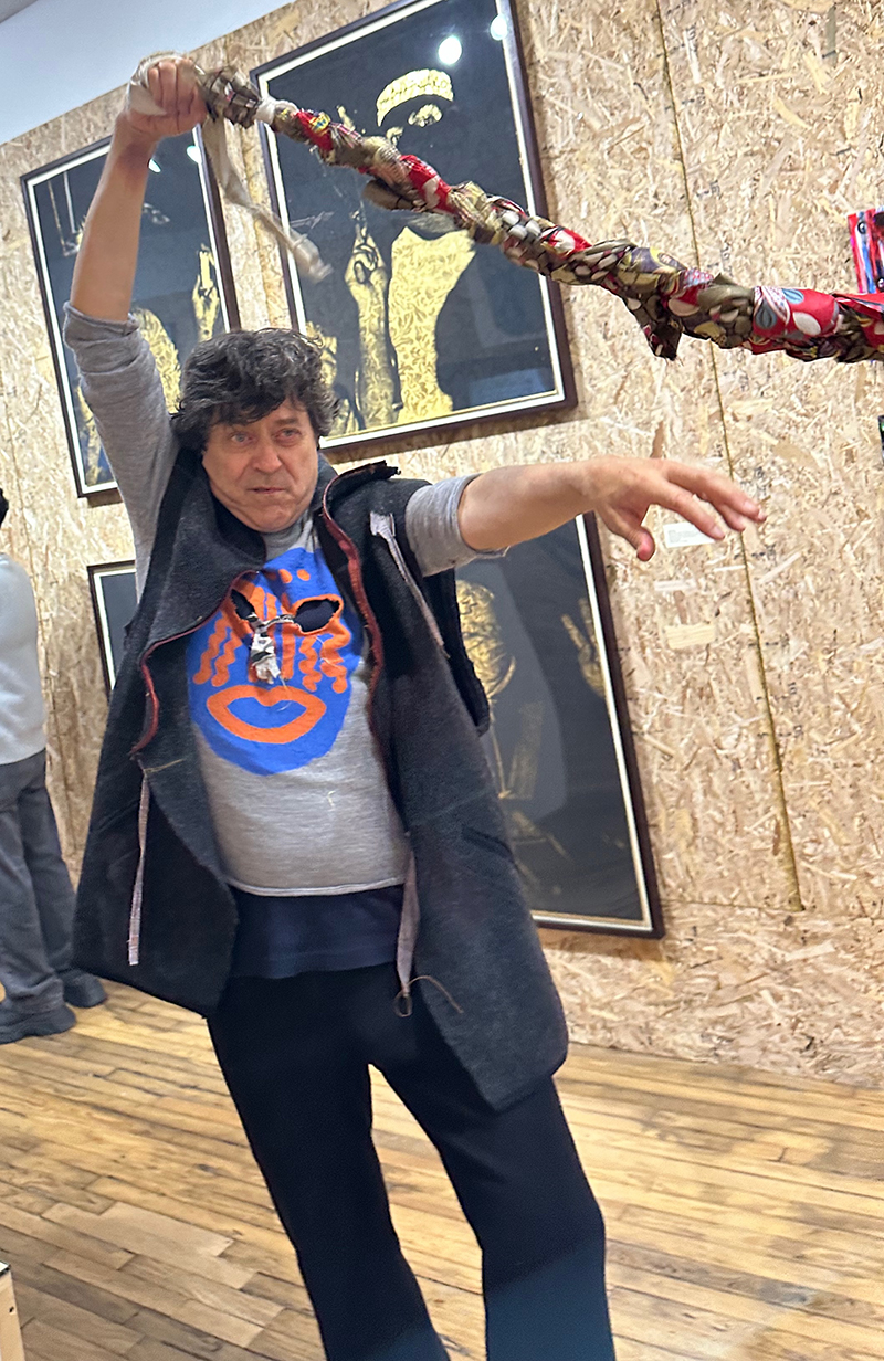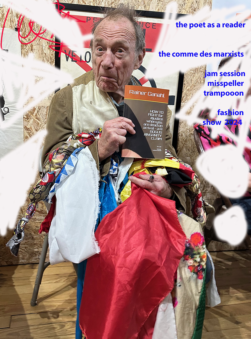 the designer - performer - scare crow as a model - rainer ganahl - reading from his book - see below - here with a COMMEDERSMARXISTS snapper made of prestine textiles - note the seasonal "walker" -- an Austrian "nuclear" option reworked (WALK - austrian-boiled-wool-walk-jacket - ADAPTED FOR THE EVENT