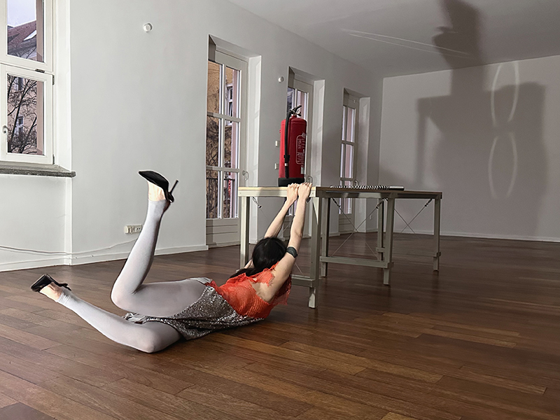 doesn't that remind you of a form of execution jump board -- a shadow fight over territory and modes of being --- save the planet with read couture and show the colors of the revoution and for freedom - sustainability and proper mutual understanding without wars - done in a site that was curxial during the 20th century -- near Stalin / Marx allee BERLIN