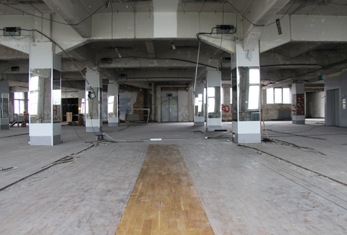 Wera Buck, Elmar Mellert, RENOVATION II, 2014 these guys restored a 1 meter wide strip of the third floor of the building including the ceiling, the windows and heaters as if creating a properly restored loop -- believe it was a 10 day tour the force up to midnight every day to bring that strip up to code this installation is hard to photograph due to the changing circumstances of the light and its reflection - also see. how the surrounding dirt accumulates quickly on the resordet hard wood floor (germ. Parketboden)