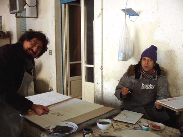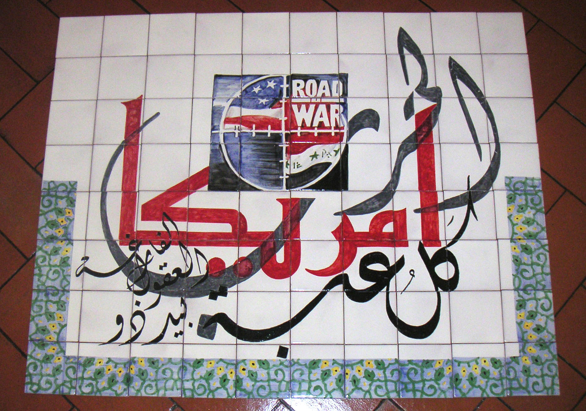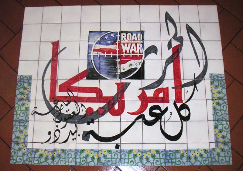 (click image to get high resolution image) Rainer Ganahl ARAB DIALOG WITH GHAZI AL DELAIMI, ROAD TO WAR, 2002/03 Calligraphy and Arabic text: Ghazi al Delaimi; graphics: Alida Sini and Gianna Vacca at ceramic studio: Ernan, Albisola. Translation by Ghazi al Delaimi: War games for silly big boys. Size: 80 cm x100 cm x 1 cm materials: ceramic tiles: 80 individual pieces, certificate of authenticity photo: Rainer Ganahl