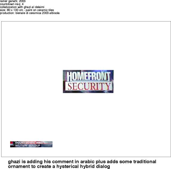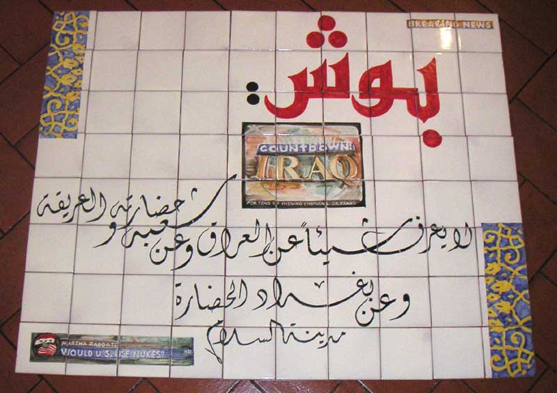 (click image for high resolution) Rainer Ganahl ARAB DIALOG WITH GHAZI AL DELAIMI, COUNTDOWN IRAQ, WOULD U. S. USE NUKES?, 2002/03 Calligraphy and Arabic text: Ghazi al Delaimi; graphics: Alida Sini and Gianna Vacca at ceramic studio: Ernan, Albisola. Translation by Ghazi al Delaimi: Bush doesn't know anything about Iraq and its cultural heritage. He has no clue about the old city of Baghdad once named Mdinet-al-salam : city of peace. Size: 80 cm x100 cm x 1 cm materials: ceramic tiles: 80 individual pieces, certificate of authenticity photo: Rainer Ganahl