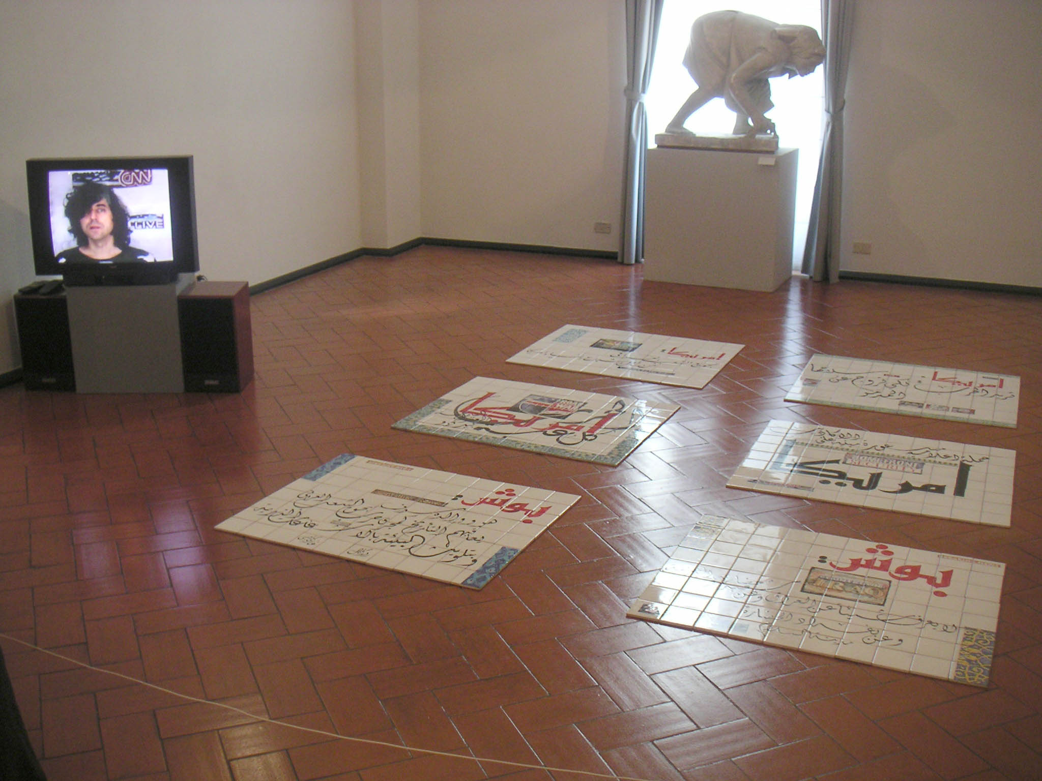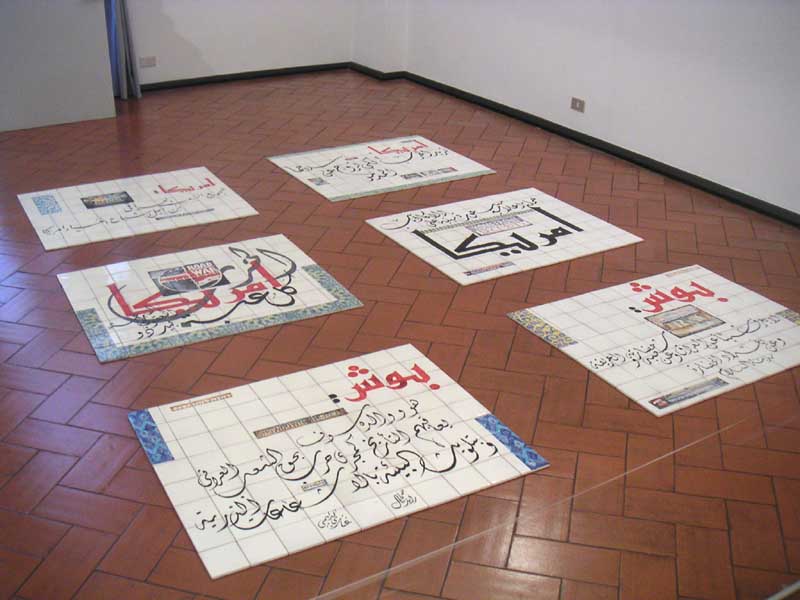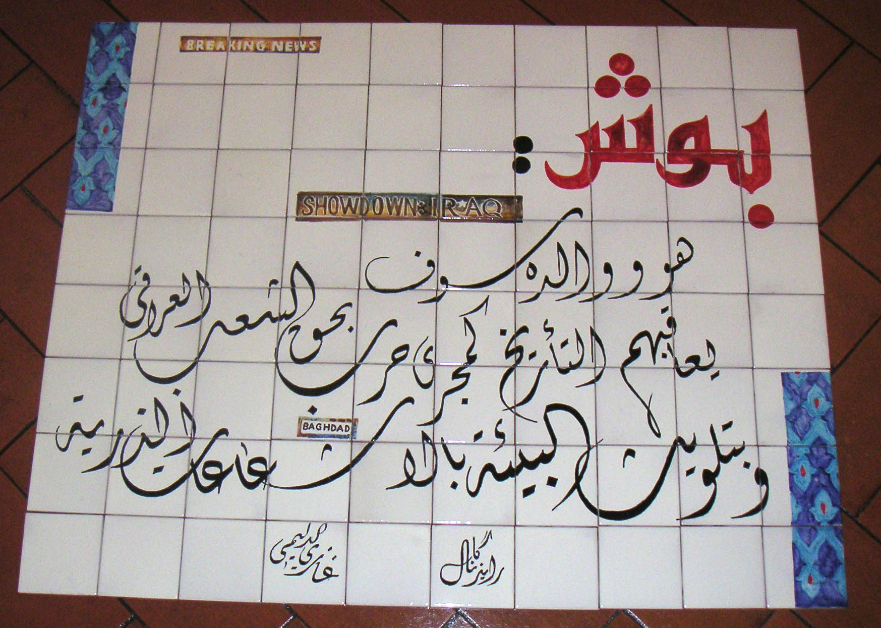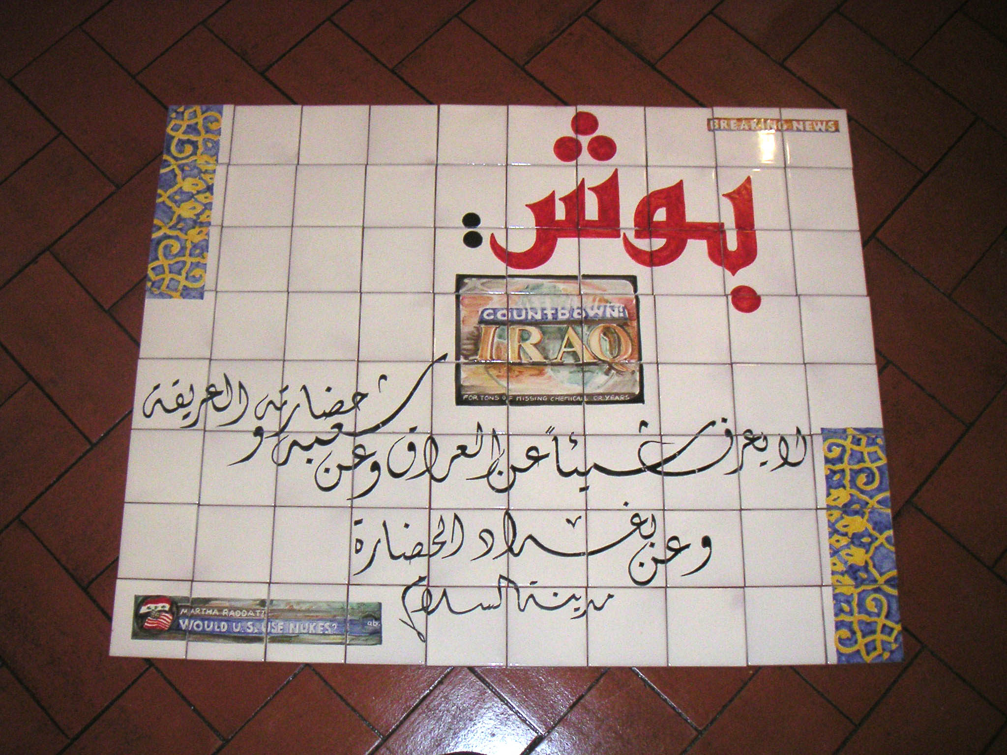 (click image to get high resolution picutre) Rainer Ganahl ARAB DIALOG WITH GHAZI AL DELAIMI, BREAKING NEWS, SHOWDOWN IRAQ, BAGHDAD, 2002/03 Calligraphy and Arabic text: Ghazi al Delaimi; graphics: Alida Sini and Gianna Vacca at ceramic studio: Ernan, Albisola. Translation by Ghazi al Delaimi: Bush and his father will enter history as war criminals against the Iraqi people and as scrupelless destroyer of the environment deploying radioactive weapons. Size: 80 cm x100 cm x 1 cm materials: ceramic tiles: 80 individual pieces, certificate of authenticity photo: Rainer Ganahl