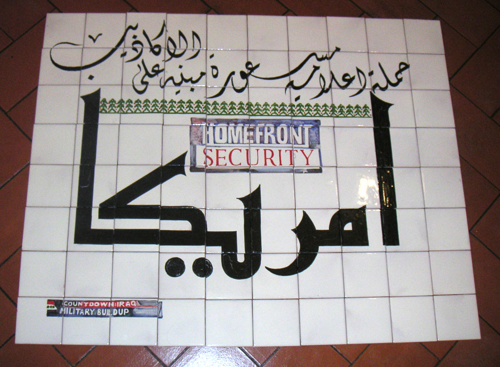 (clcik image for high res. image) Rainer Ganahl ARAB DIALOG WITH GHAZI AL DELAIMI, HOMEFRONT SECURITY, COUNTDOWN IRAQ, 2002/03 Calligraphy and Arabic text: Ghazi al Delaimi; graphics: Alida Sini and Gianna Vacca at ceramic studio: Ernan, Albisola. Translation by Ghazi al Delaimi: A disgusting smear campaign against Iraq built on lies. Size: 80 cm x100 cm x 1 cm materials: ceramic tiles: 80 individual pieces, certificate of authenticity photo: Rainer Ganahl
