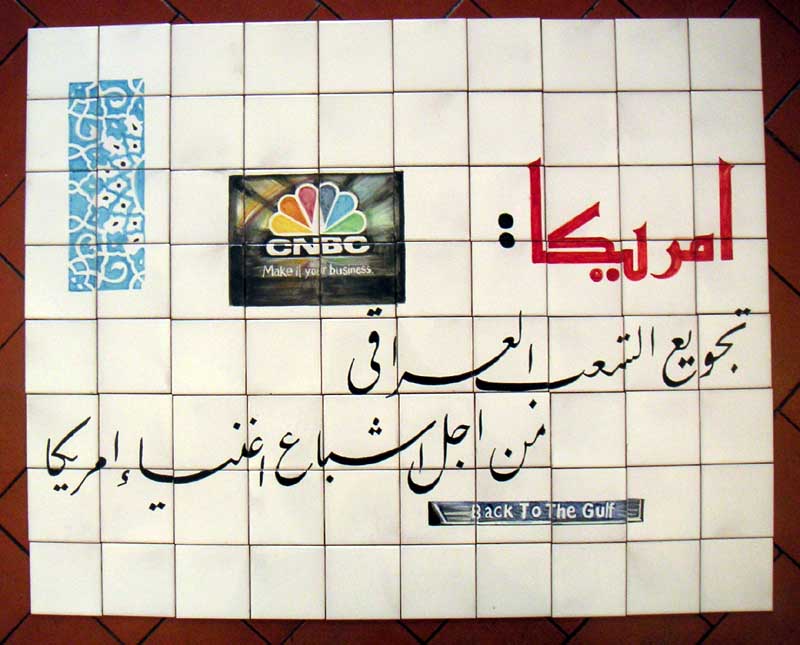 (click image to get high res. picutre) Rainer Ganahl ARAB DIALOG WITH GHAZI AL DELAIMI, CNBC, MAKE IT YOUR BUSINESS, BACK TO THE GULF, 2002/03 Calligraphy and Arabic text: Ghazi al Delaimi; graphics: Alida Sini and Gianna Vacca at ceramic studio: Ernan, Albisola. Translation by Ghazi al Delaimi: America starves the Iraq people in order to render the rich Americans even richer. Size: 80 cm x100 cm x 1 cm materials: ceramic tiles: 80 individual pieces, certificate of authenticity photo: Rainer Ganahl