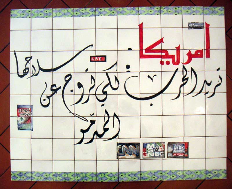 (click image to receive high resolution image) Rainer Ganahl ARAB DIALOG WITH GHAZI AL DELAIMI, ATTACK ON IRAQ?, C-SPAN, CNN, FOX NEWS..., 2002/03 Calligraphy and Arabic text: Ghazi al Delaimi; graphics: Alida Sini and Gianna Vacca at ceramic studio: Ernan, Albisola. Translation by Ghazi al Delaimi: America wants this war in order to demonstrate its latest weapons of destruction. Size: 80 cm x100 cm x 1 cm materials: ceramic tiles: 80 individual pieces, certificate of authenticity photo: Rainer Ganahl