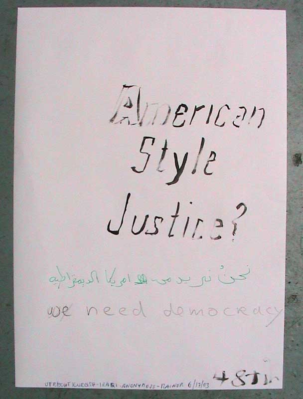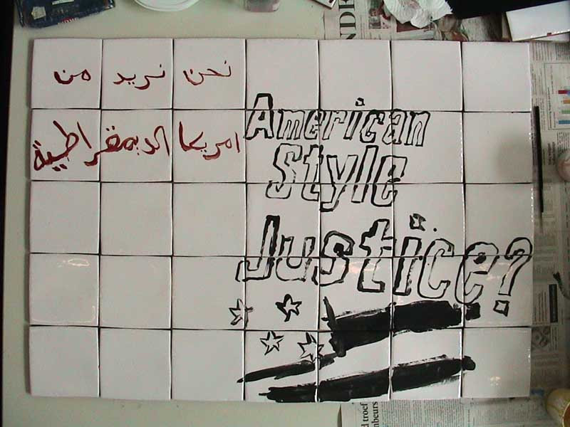 IRAQ DIALOG: AMERICAN STYLE JUSTICE?, 2003 Arabic text and calligraphy by anonym, 2003 translation: WE NEED DEMOCRACY painted and fired ceramic tiles, size : 50 cm x 70 cm