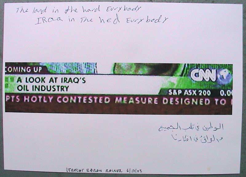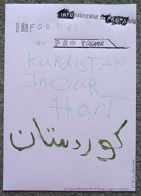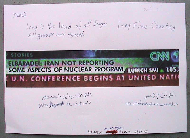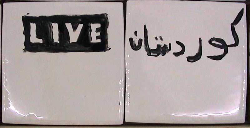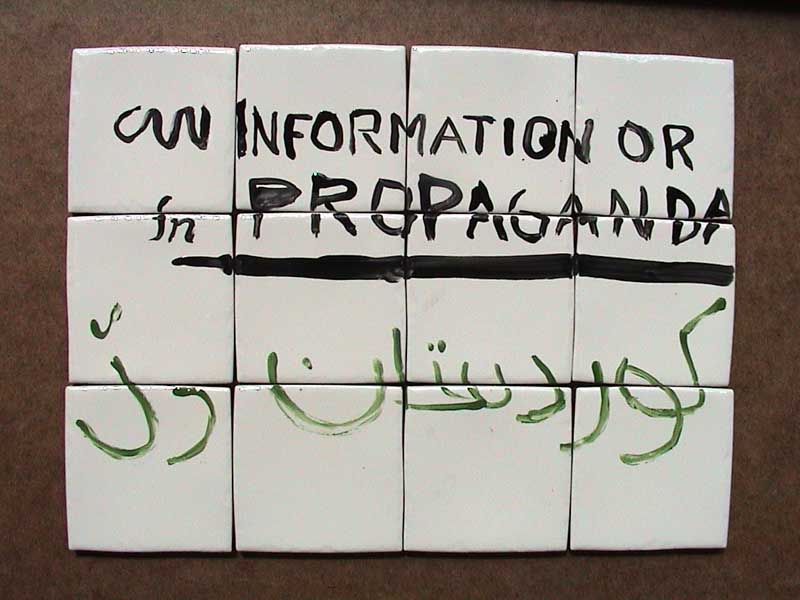 IRAQ DIALOG: CNN INFORMATION OR PROPAGANDA, 2003 Arabic text and calligraphy by anonym, 2003 translation: KURDISTAN ISIN OUR HEART painted and fired ceramic tiles, size : 30 cm x 40 cm