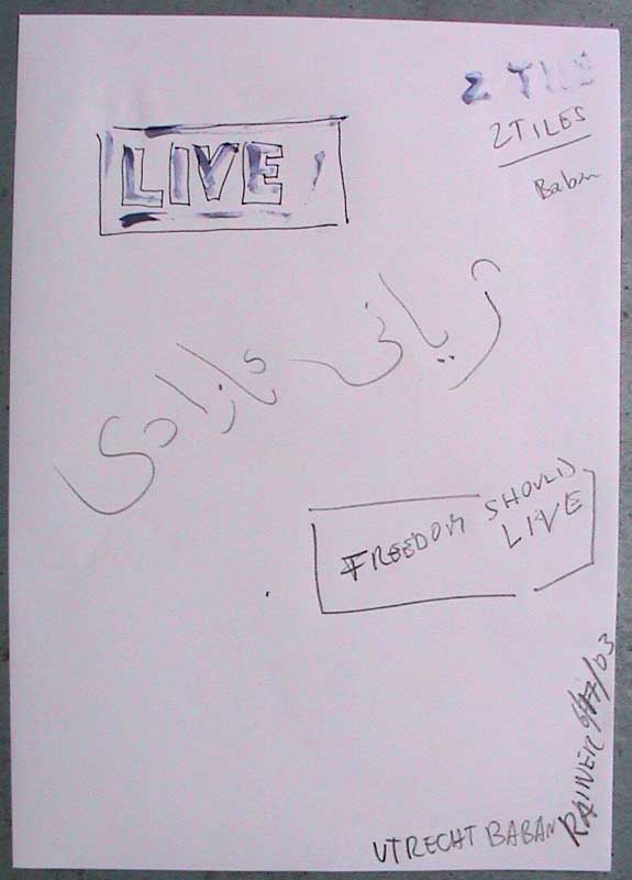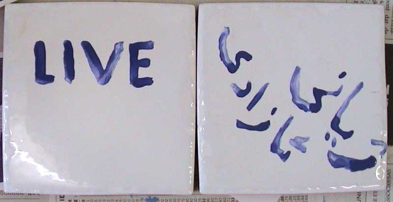 Rainer Ganahl Iraq-dialog: LIVE (blue), 2003 Arabic text and calligraphy by Baban, 2003 translation: freedom should live! painted and fired ceramic tiles, size : 10 cm x 20 cm