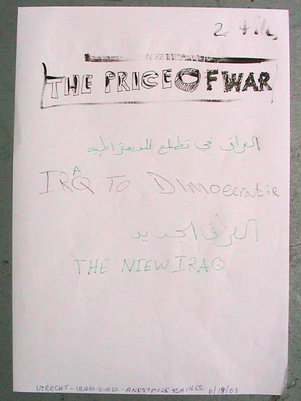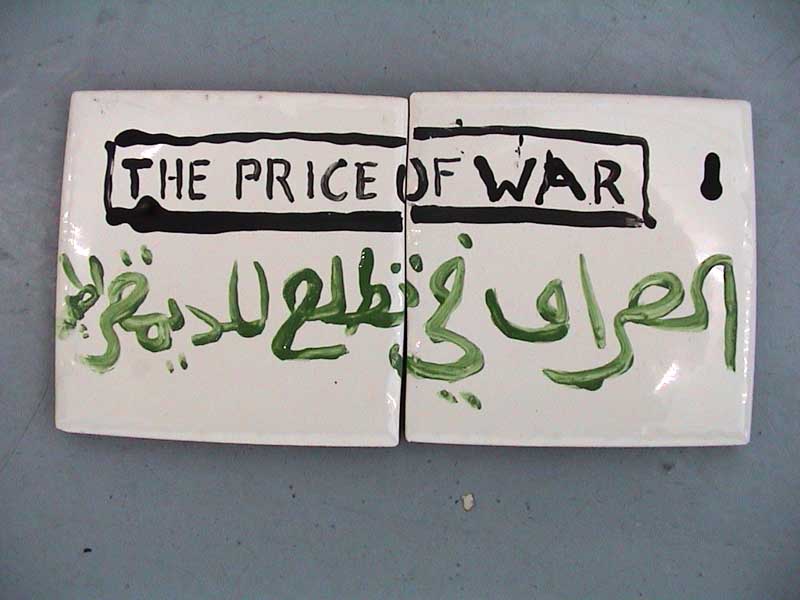 IRAQ DIALOG: THE PRICE OF WAR , 2003 Arabic text and calligraphy by anonym, 2003 translation: IRAQ TO DEMOCRACY painted and fired ceramic tiles, size : 10 cm x 20 cm