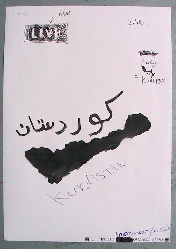 born in Iraq, Kirkuk, living in Holland. and belongs to the group of Iraqi Kurds. objecting the "anti-american tendency of this work" (in his words) he denied to give his ID and later also stopped working. (I don't see my work as "Anit-American" - I see it as a way to promote better understanding of the "other side" , something that hopefully will result in political changes that then will show "pro-American" effects. I love America and Europe and the Arab World and Israel and Pakistan and India and Africa. I hate politics that result in murder, in killing and violence, in unjustice and exploitation)
