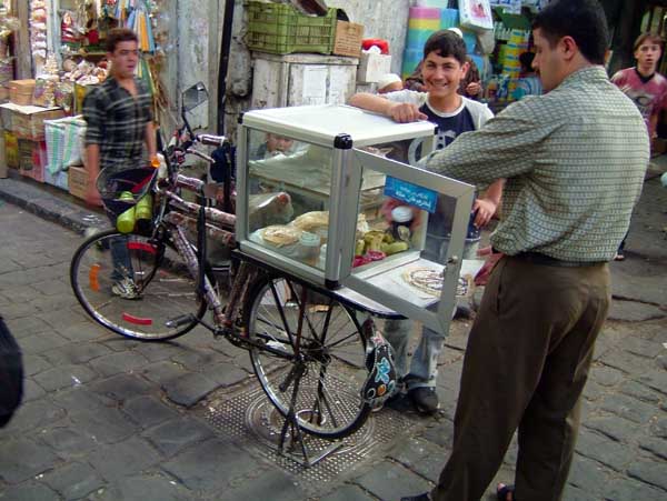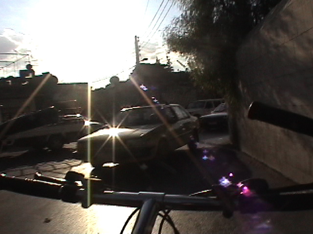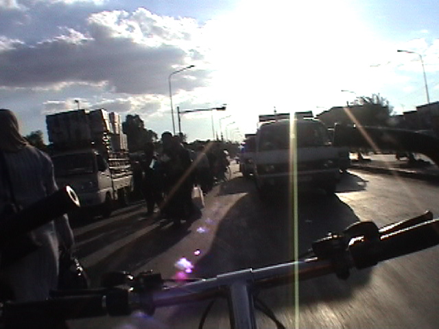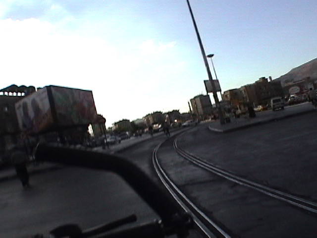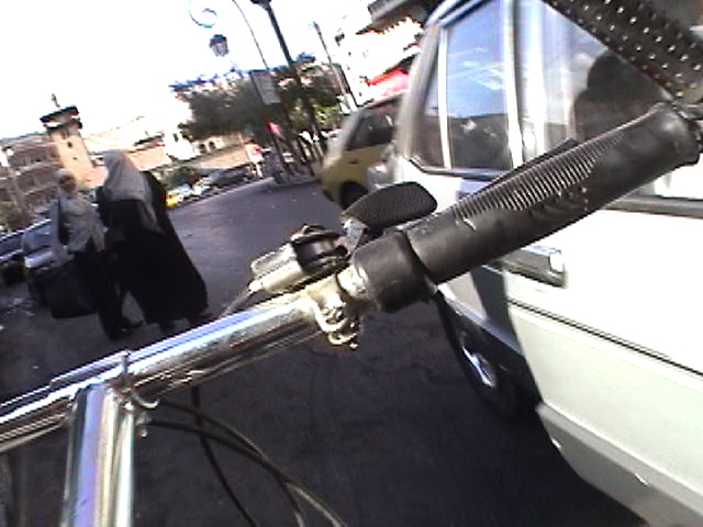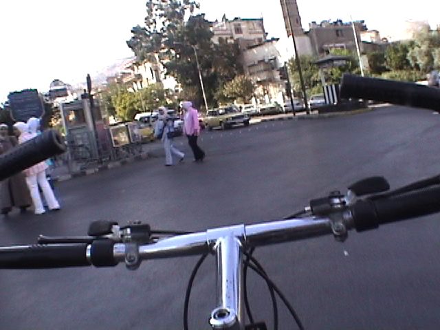 BICYCLING DAMASCUS, 2004 - 90 min Bicycling Damascus is my second video - after Bicycling Tirana - for which I visit a city with a bicycle. I bicycle against the traffic while filming without holding the steering wheel. I drive for 90 minutes around this ancient city filming directly across the steering wheel thus rendering it into cross hairs. This brings me through a variety of different neighborhoods and places that give a cityscape quite surprising to see. This risky and unlawful engagement with the bicycle, the city and my camera creates an anti-gravitational epic of traffic jams, busy people and a colorful middle eastern street live in a country, the US State Department considers to be involved with terrorism and weapons of mass destruction. (Syria indeed does have very bad human right reports and still has to come to terms with the massacre of Hama, a rebellious city where president Assad ordered 1982 the killing of around 40.000 inhabitants.) The bicycle is not only my unique vehicle of transportation but also my urban eyeglass - some extension of my visual and acoustic organs. As such it is a real social urban interface. I'm a bicycle rider since early childhood. My first birthday present I remember was a bicycle. I have never stayed in a place for long without a bicycle, including in Tokyo where I was harassed daily by the police for riding a bicycle. (I was considered a bicycle thief). The bicycle I used in Damascus was lent to me. I hired it for half the price of a new Syrian bicycle. The bicycle was lent to me by a tailor. Syria has a beautiful domestic bicycle production. They all look the same but don't even function as new one's in the shop. The more useable bicycles are now imported from China. (I hope I don't offend anybody with my comment but unfortunately, that was my experience: Ii fell in love with the local 'every body the same bicycle' but I came to understand that it was nearly impossible to ride them, nothing functioned properly - that kept me from buying one, from exporting one) A part from this lousy = expensive = lending practice, the bicycle lent to me was very bad. Not only did it have barely any breaks but also, the bicycle was shaking to the point of ...me falling off. It took me about one hour to get used to it. Riding without holding the steering wheel requires a bicycle that is stable and predictable, in particular if one drives dangerously. This bicycle was shaking nonstop and performed quite dangerously. I had a couple of quasi-accidents and falloffs. In the end I survived.. - voila la video (close window to return) (an extract of 3 min - the total is 90 min - unedited)
