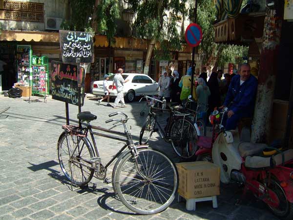 Below, seea typical standart Syrian bicycle that doesn't quite work as well as it looks:- others are leaning by. the one in the forground serves as a advertisment poll.