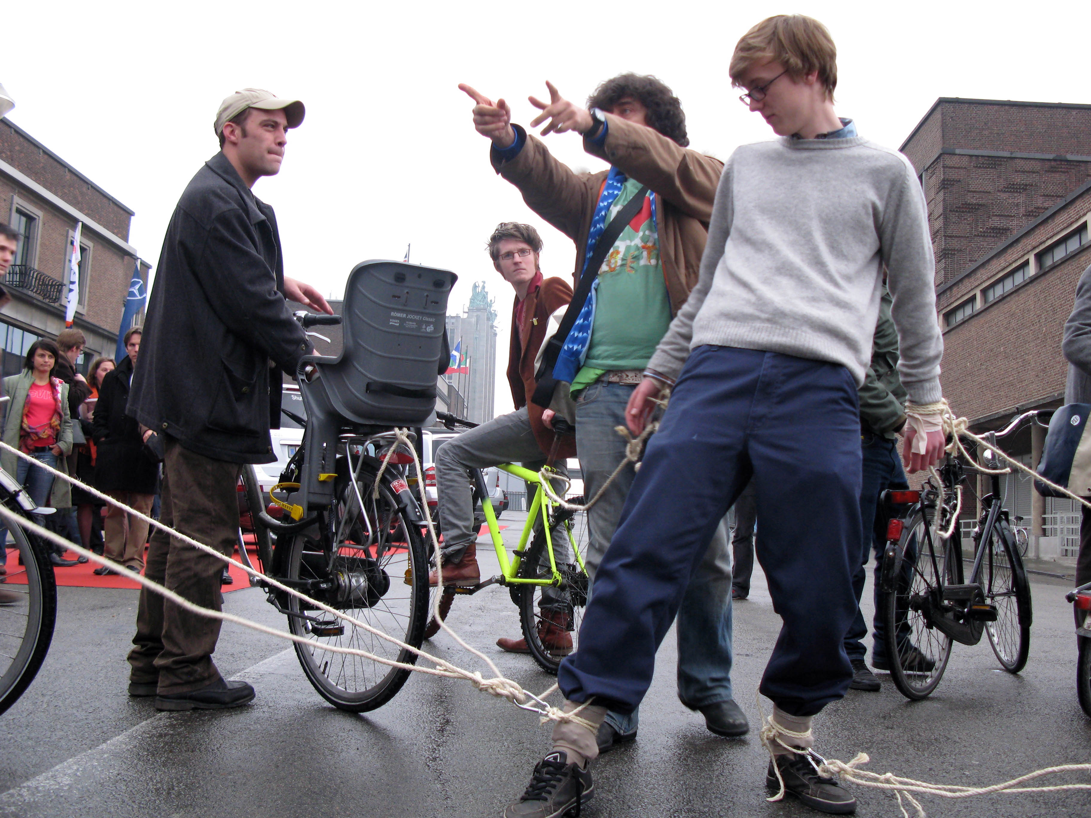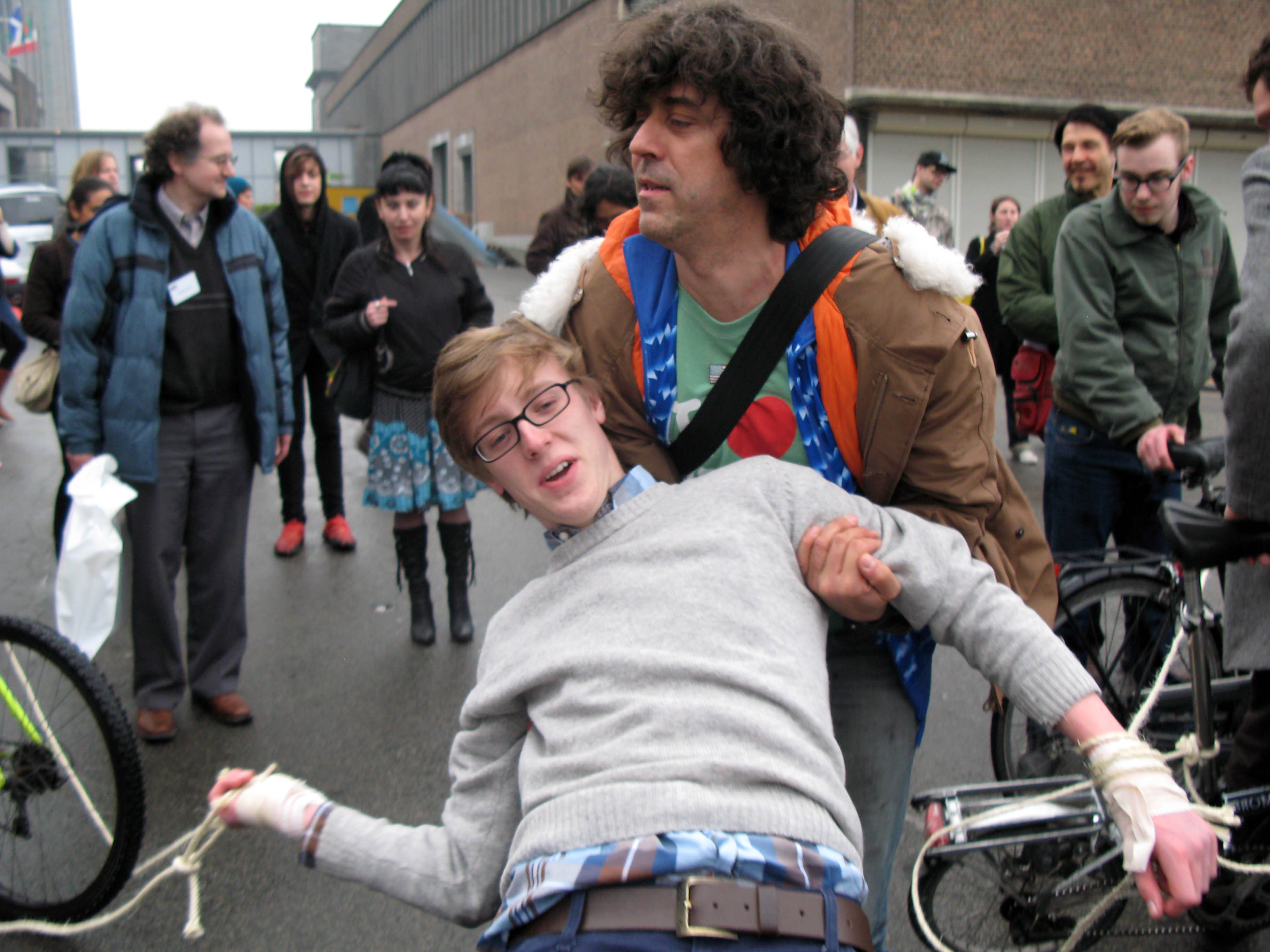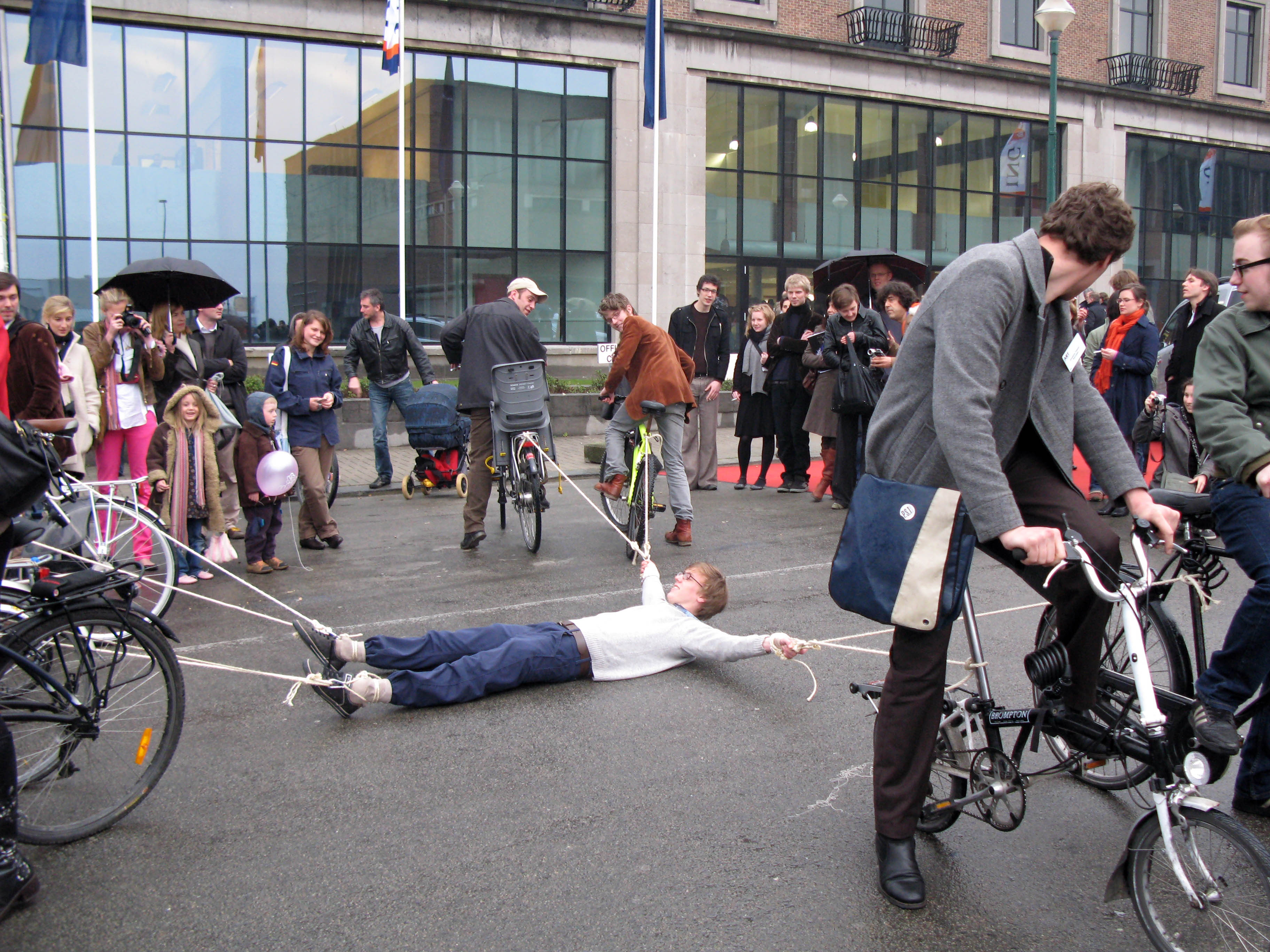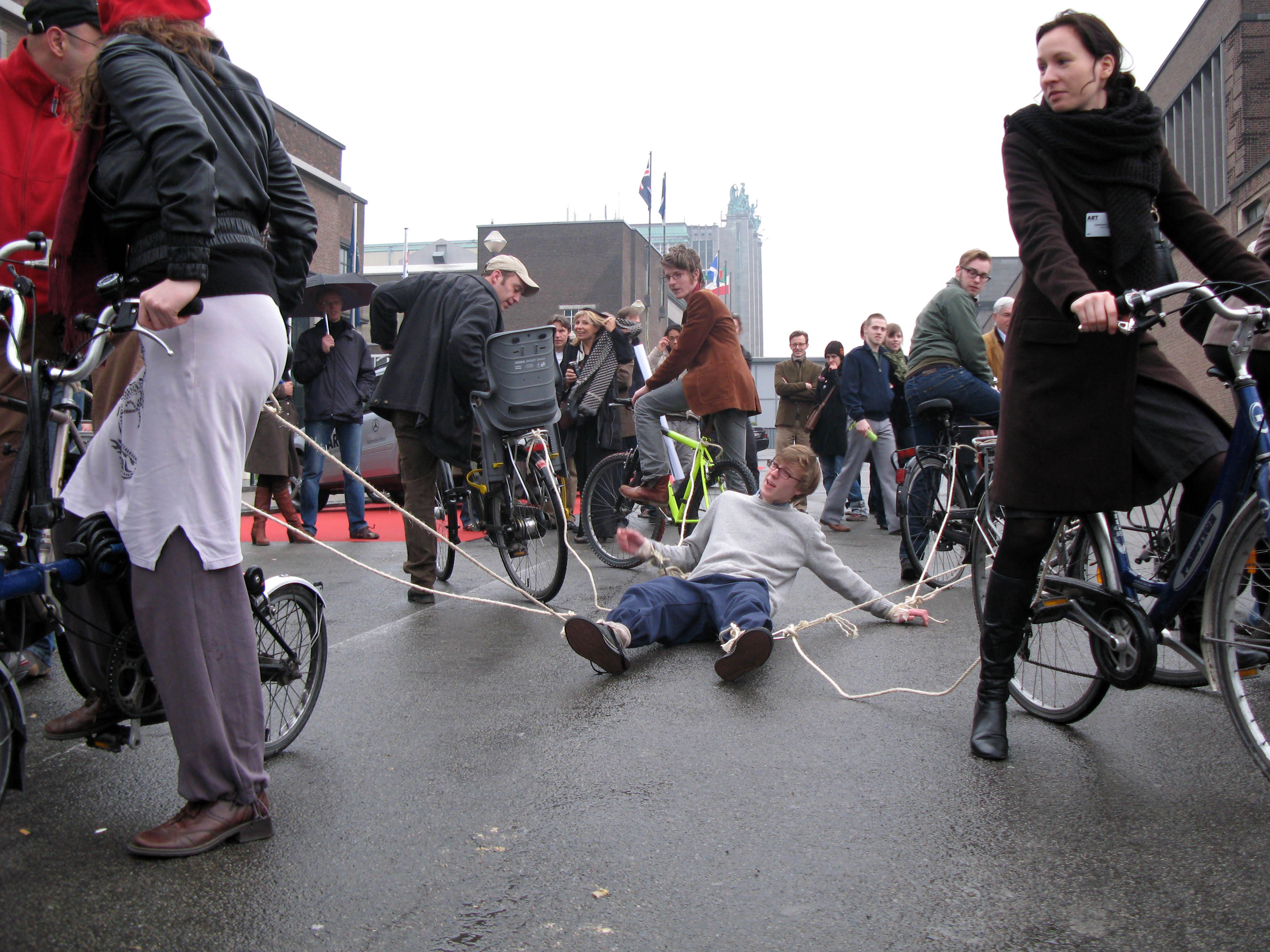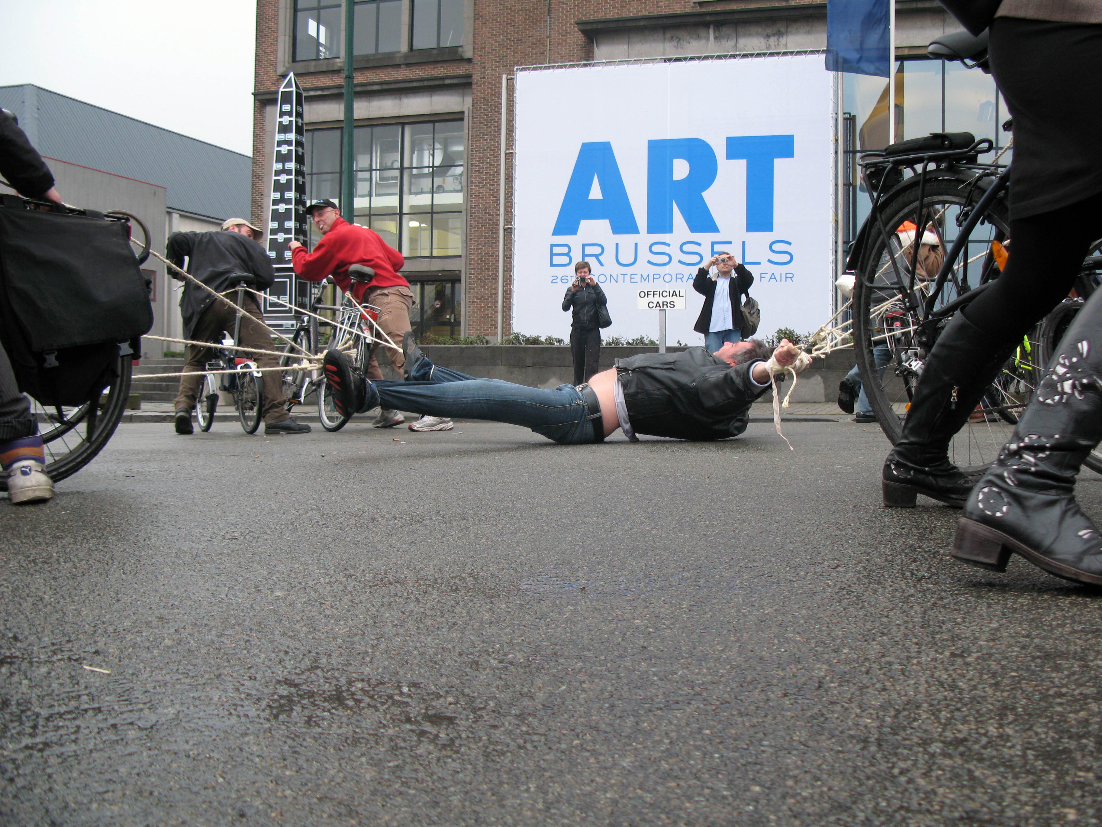 Basic Belgium - Bicycle Quartering, Brussels April 19, 2008 Quartering was a middle age torture technique very well analysed in Michel Faucoult's Discipline and Punish. In late 2007 when the discussion about interrogation techniques was at a hight in the USA - waterboarding etc. - I decided to restage a quartering but one without horse power. Whereas they used 4 horses to pull a body apart and have the limps be transported to the end of the kinddome, I used bicycle / man/woman power fo this act.. In NYC's performance, I was myself the person to be quartered. I dressed in orange and was able to keep up the pressure for about a couple fo minutes. Asked by Filip Luyckx to do something for his exhibition "ephemeral frindges" for art brussels I opted for the same performance but with a different content. When in NYC the actual torture discussion was the main objective - together wiht the bicycle issues (we did it in the middle of a crossroad and blocked traffic.. so it can also be read as a metaphor to what happens to bicyclists in NYC traffic where bike lanes are still not the norm - .. So for Belgium I was thinking to the language conflict and the actual Beligium problem to resolve basic political questions about the unity of the country.. there are divisionist forces at work and the word crisis is often emploid. Therefore I asked the organizer to find us some voluntiers who's parents are from both contexts.. flemsh and vallonish (French) - so pulling them apart as others try to pull on the cultural and political map. To wonderfun performers where found, a art student, and .... a philosopher. Both object the devisionism that stresses Belgium, ironically, the country headquateringf the European Union. I'm thankfull to all the bicyclsits who helped me and rode the long trip in a rather shitty wet weather.