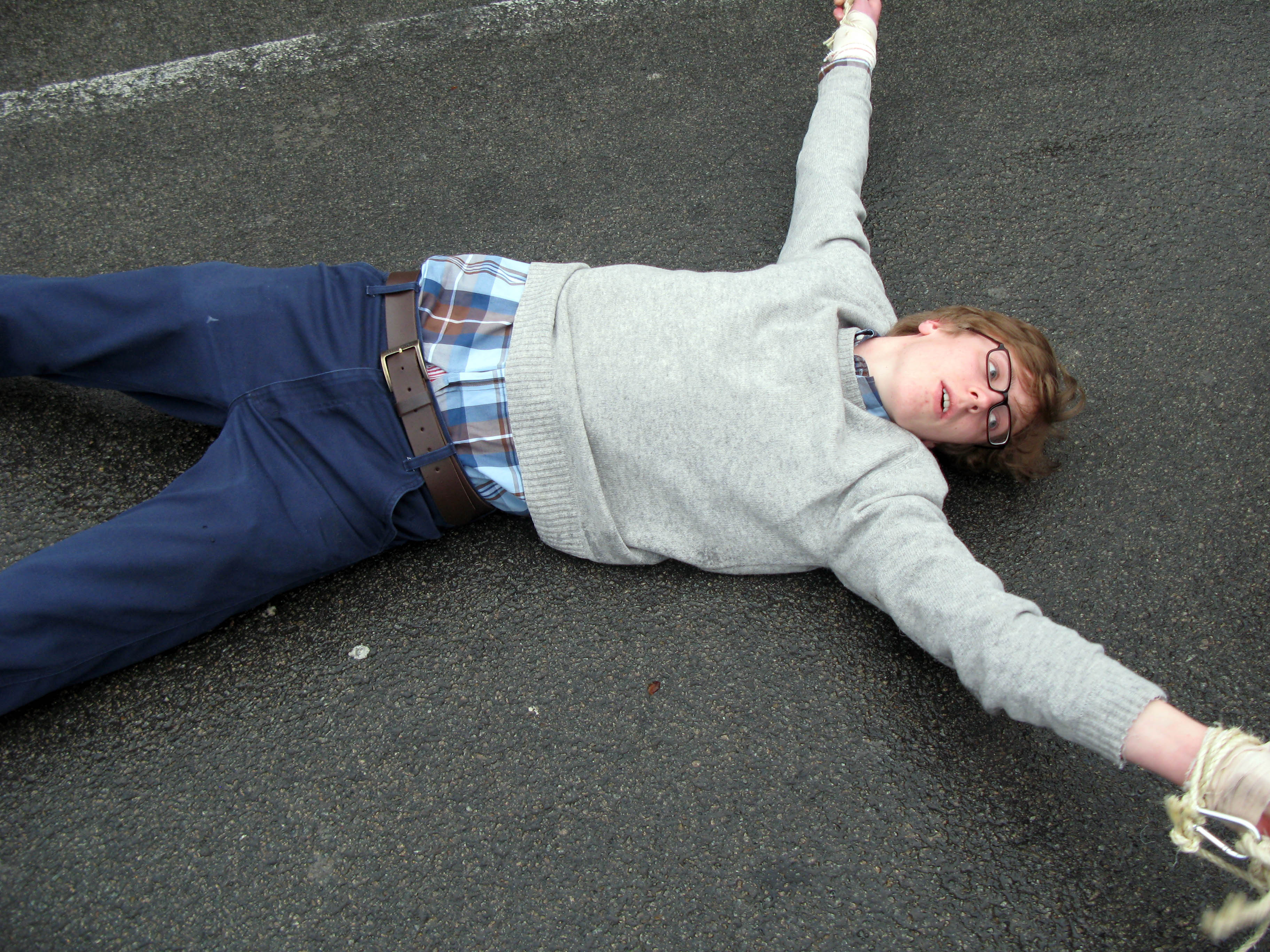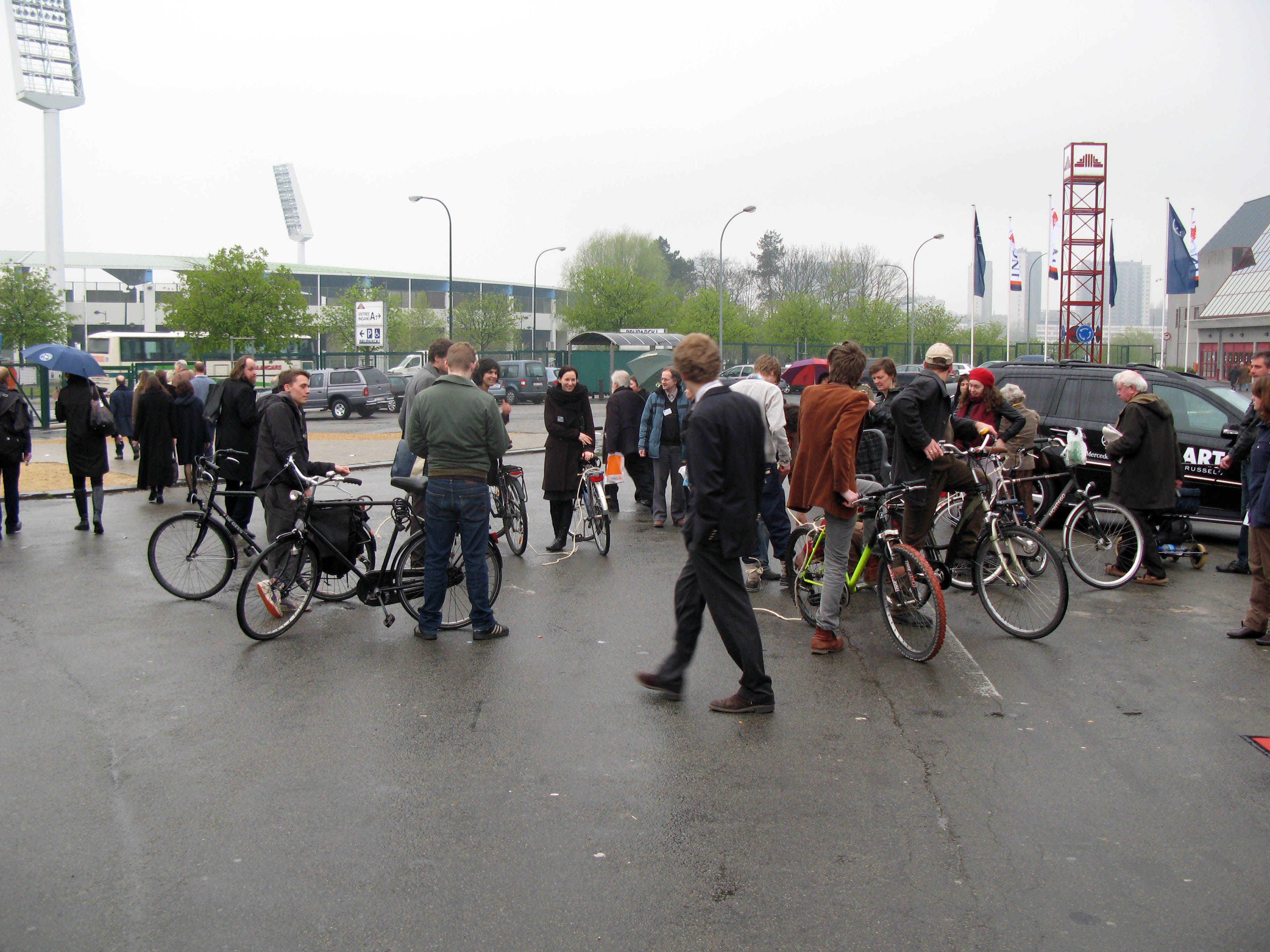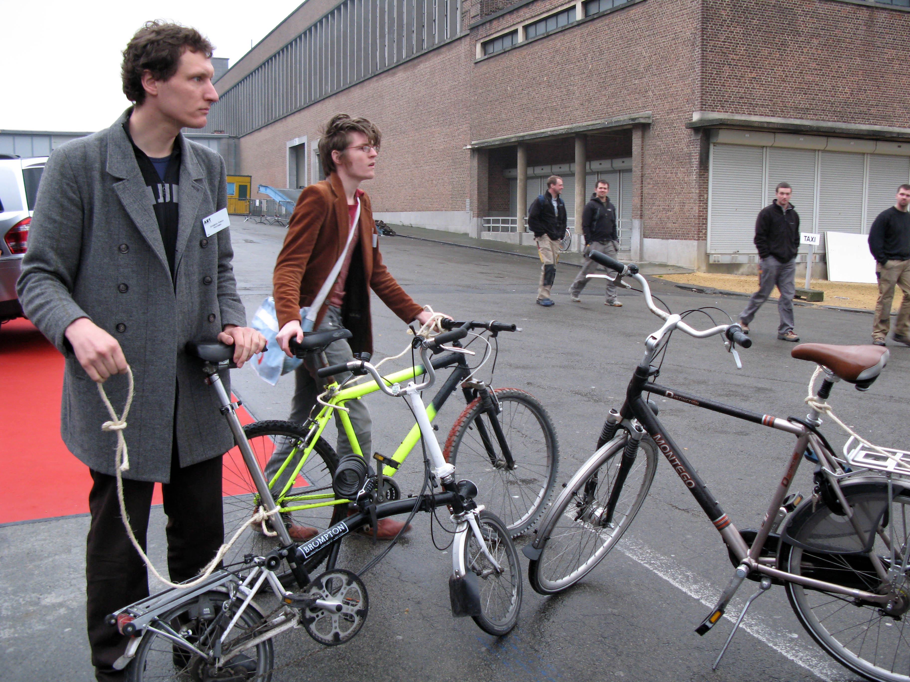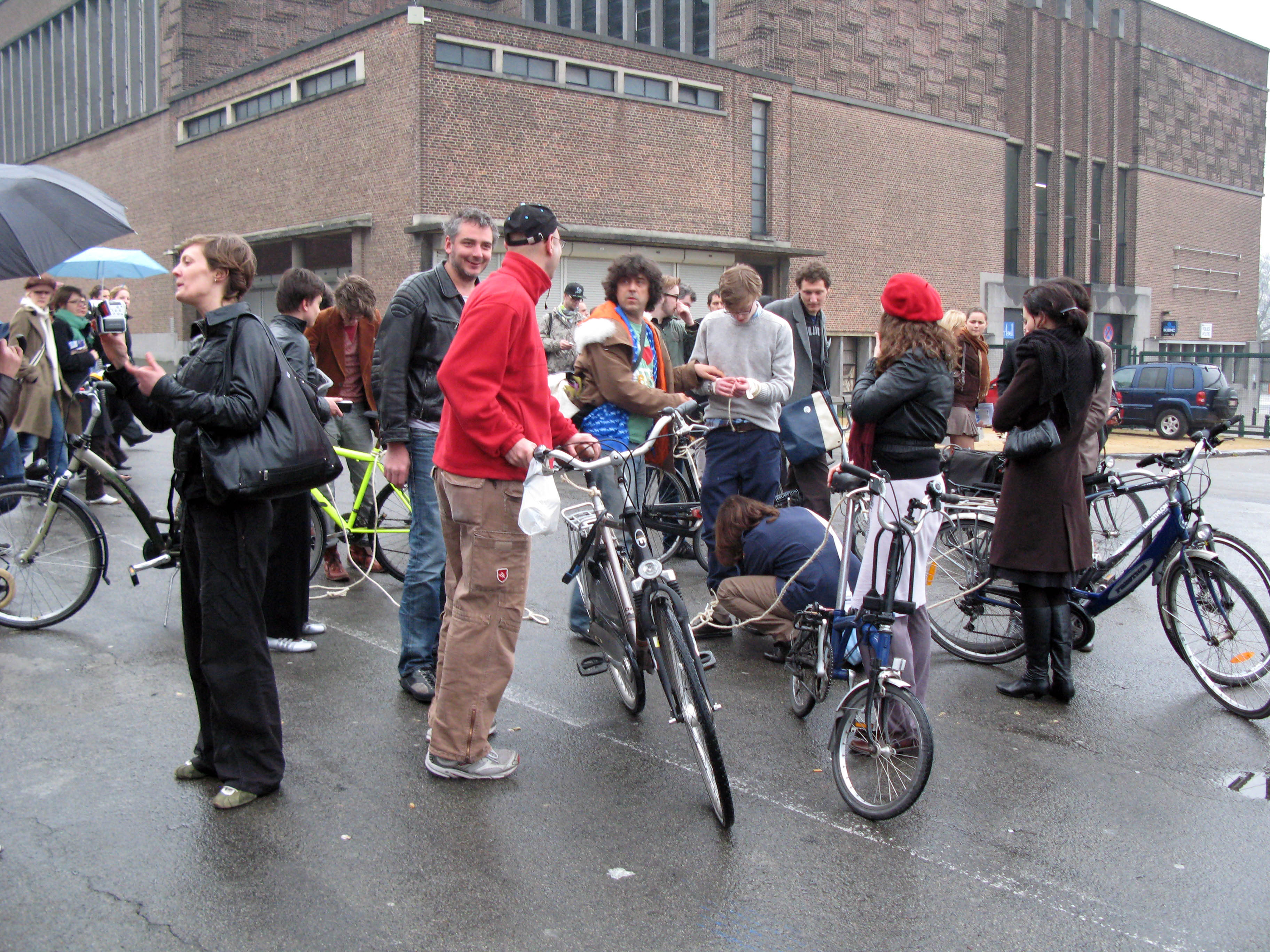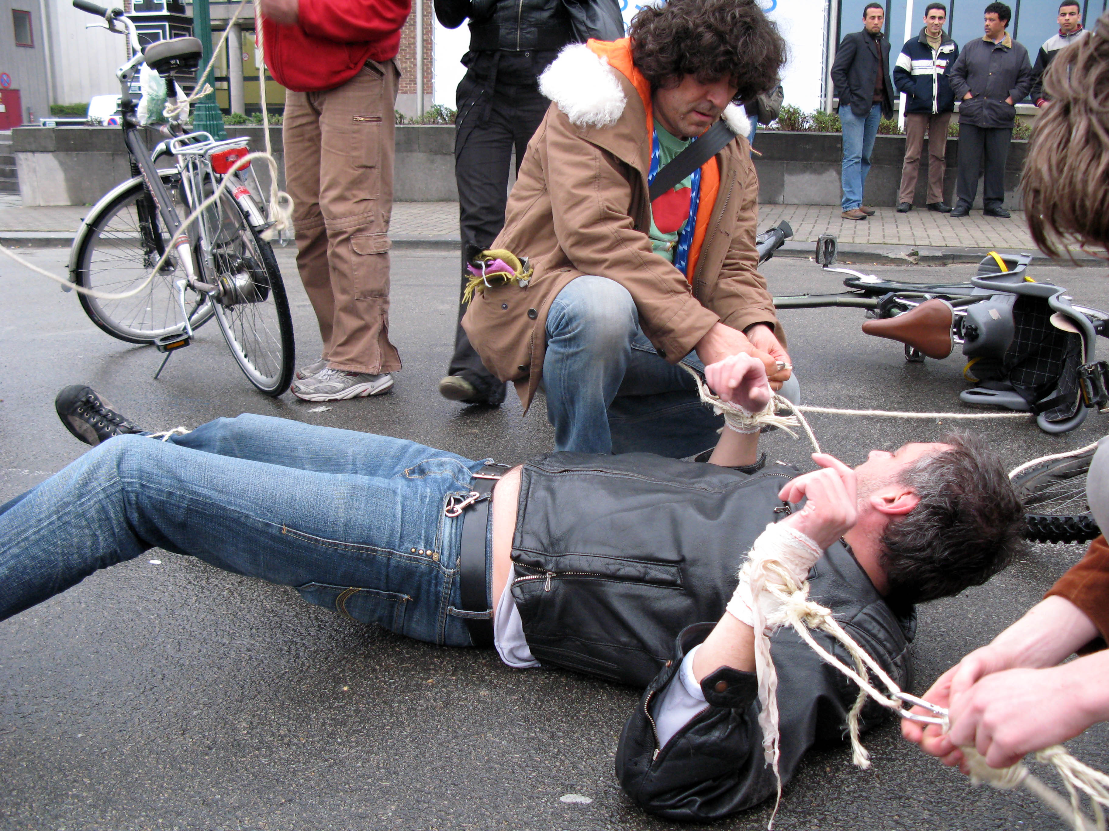 Basic Belgium - Bicycle Quartering, Brussels April 19, 2008 Quartering was a middle age torture technique very well analysed in Michel Faucoult's Discipline and Punish. In late 2007 when the discussion about interrogation techniques was at a hight in the USA - waterboarding etc. - I decided to restage a quartering but one without horse power. Whereas they used 4 horses to pull a body apart and have the limps be transported to the end of the kinddome, I used bicycle / man/woman power fo this act.. In NYC's performance, I was myself the person to be quartered. I dressed in orange and was able to keep up the pressure for about a couple fo minutes. Asked by Filip Luyckx to do something for his exhibition "ephemeral frindges" for art brussels I opted for the same performance but with a different content. When in NYC the actual torture discussion was the main objective - together wiht the bicycle issues (we did it in the middle of a crossroad and blocked traffic.. so it can also be read as a metaphor to what happens to bicyclists in NYC traffic where bike lanes are still not the norm - .. So for Belgium I was thinking to the language conflict and the actual Beligium problem to resolve basic political questions about the unity of the country.. there are divisionist forces at work and the word crisis is often emploid. Therefore I asked the organizer to find us some voluntiers who's parents are from both contexts.. flemsh and vallonish (French) - so pulling them apart as others try to pull on the cultural and political map. To wonderfun performers where found, a art student, and .... a philosopher. Both object the devisionism that stresses Belgium, ironically, the country headquateringf the European Union. I'm thankfull to all the bicyclsits who helped me and rode the long trip in a rather shitty wet weather.