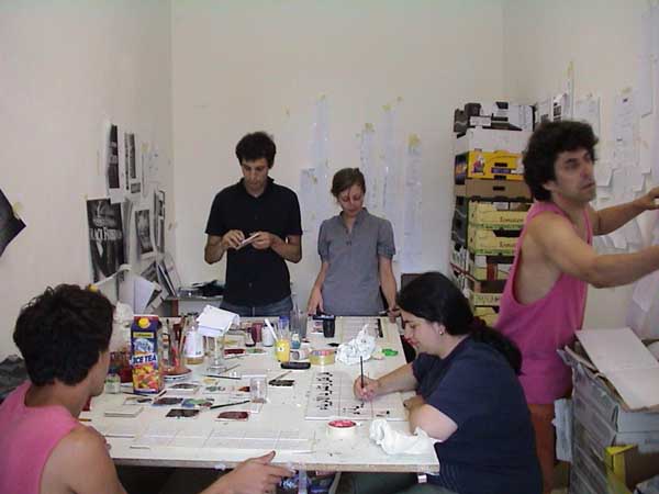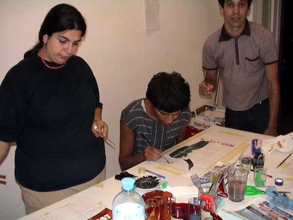 In Bremen, I am invited to an exhibition entitled: "nobody is an island." For this group exhibition in public spaces I would like to apply the Iraq Dialog works directly on the walls. We were able and gain the confidence of Binan Finjan and Ahmet Baban, both Iraqis who emigrated to Germany, living in Bremen. They both collaborated with me for this work and replied to the logos and titles of TV news regarding the Iraq crisis. The work started early 2003 before the war occured and was carried on after fighting activities were officially declared closed. More information onf Mister Finjan and Mister Baban will soon added. Working in public space is less easy than anticipated. Private property owners have all rejected our initiatives. Even installling these works in public space wasn't easy. By the time of the openingwe were able to only put up 4 pieces. production photos: