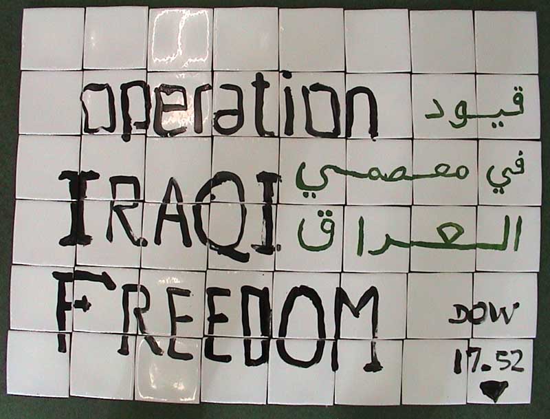 IRAQ DIALOG: OPERATION FREEDOM IRAQ, 2003 Arabic text and calligraphy by Hikmat, 2003 logo painted by RG Translation: HANDCUFFS ON IRAQ'S HANDS painted and fired ceramic tiles, size : 60 cm x 80 cm