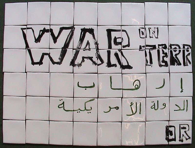 IRAQ DIALOG: WAR ON TERROR, 2003 Arabic text and calligraphy by Hikmat, 2003 logo painted by RG Translation: TERROR OF THE AMERICAN STATE painted and fired ceramic tiles, size : 60 cm x 80 cm