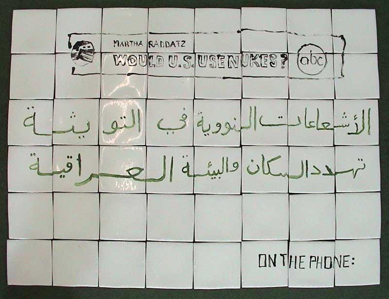 IRAQ DIALOG: WOULD U.S. USE NUKES, ABC, 2003 Arabic text and calligraphy by Hikmat, 2003 logo painted by RG Translation: NUCLEAR RADIATIONS IN TOWATHA THREATEN THE IRAQI PEOPLE AND ATMOSPHERE painted and fired ceramic tiles, size : 60 cm x 80 cm