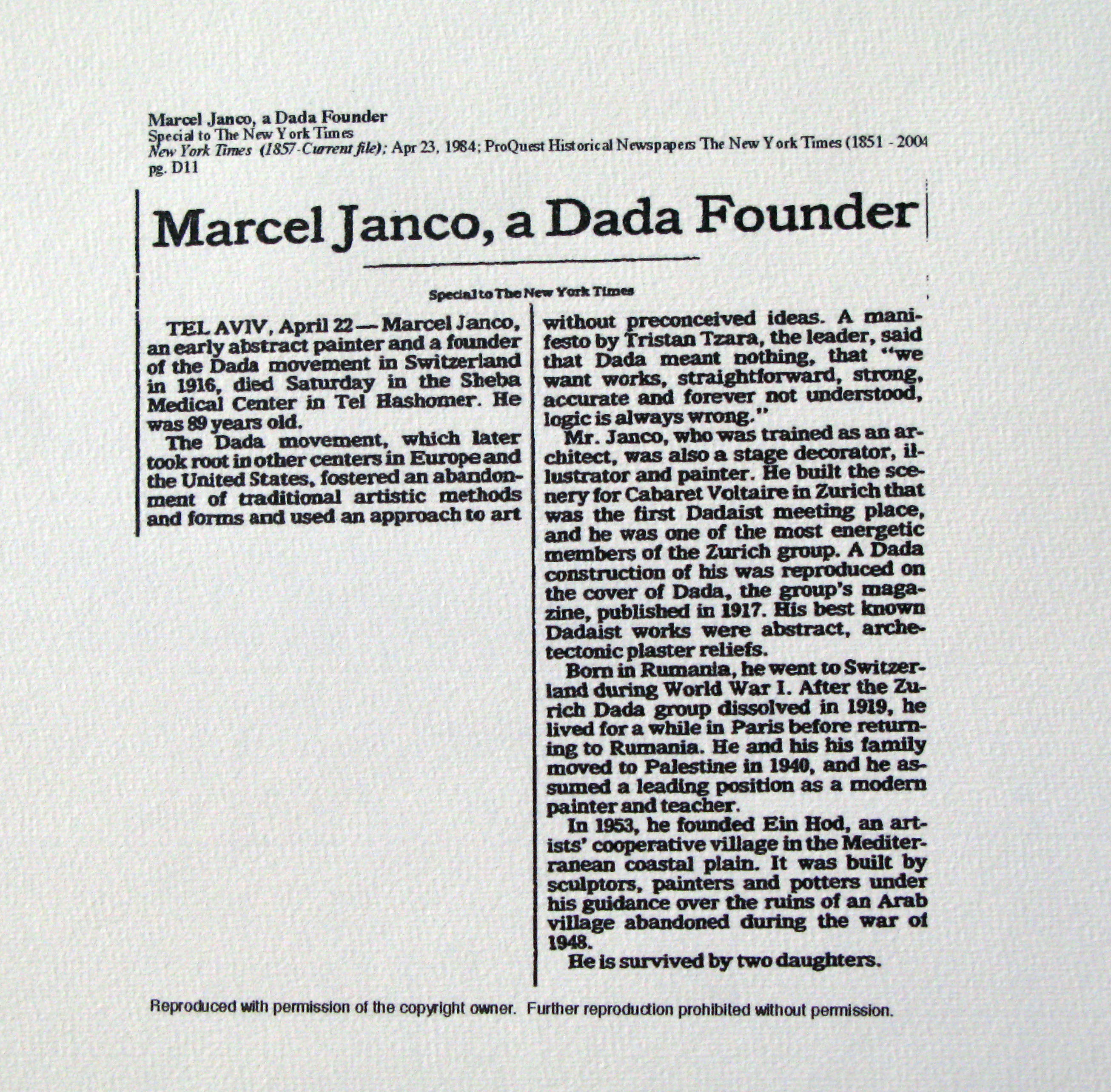 DADALENIN NY TIMES DADADEATH, Marcel Janco, 1964, 2008 ink jet print on paper, 64 x 48.5 cm / 25 1/4" x 19 1/8 inches