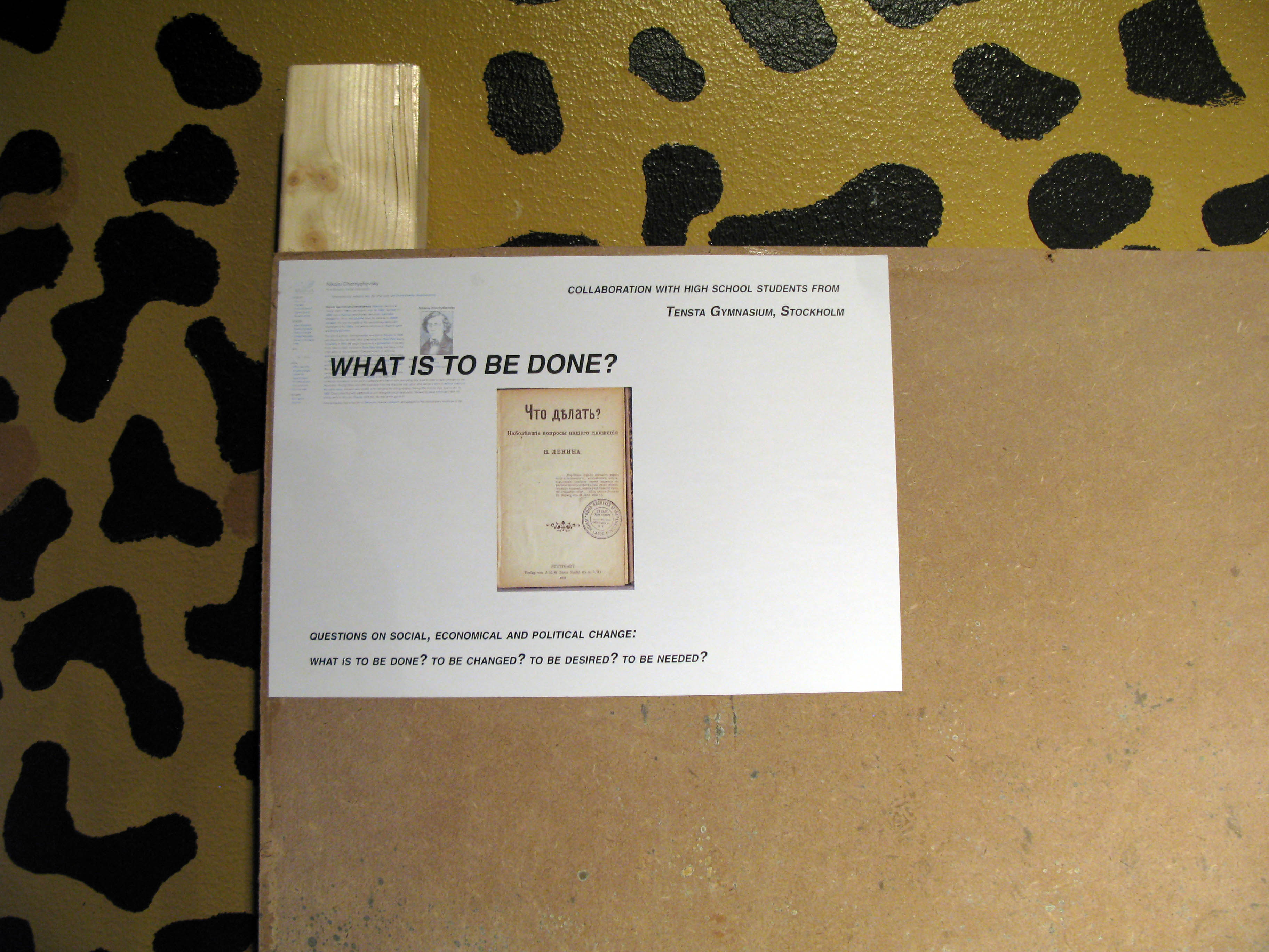 What is to be done: collaboration with tensta gymnasium high school students: dadalenintenstagymnasiumwhatistobedone? COLLABORATION BETWEEN TENSTA GYMANSIUM, DADALENIN and RAINER GANAHL at TENSTA KONSTHALL LENIN question and book title chto delat / what is to be done is taken from a russian utopian socialilst of the 19th century this important never outdated question will be also our question to the students: CHTO DELAT... WHAT IS TO BE DONE WHAT IS TO BE DONE the important and interesting question relates to many issues.. what SHOULD BE DONE.. / COULD BE DONE.. / OUGHT TO BE DONE.... SOCIALLY. POLITICALLY INTELLECTUALLY, even PRIVATELY or EDUCATIONALL PROFESSIONALLY.. ON A LARGER SCALE.. GLOBALLY.. ENVIRONMENTALLY ETC... (art, life, society, school, science technology, ecoomicts etc.. ) what is to be done the answers... provided by the students will be put up directly...