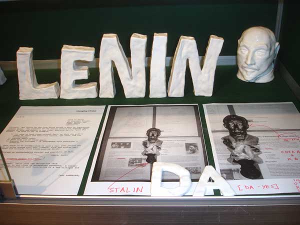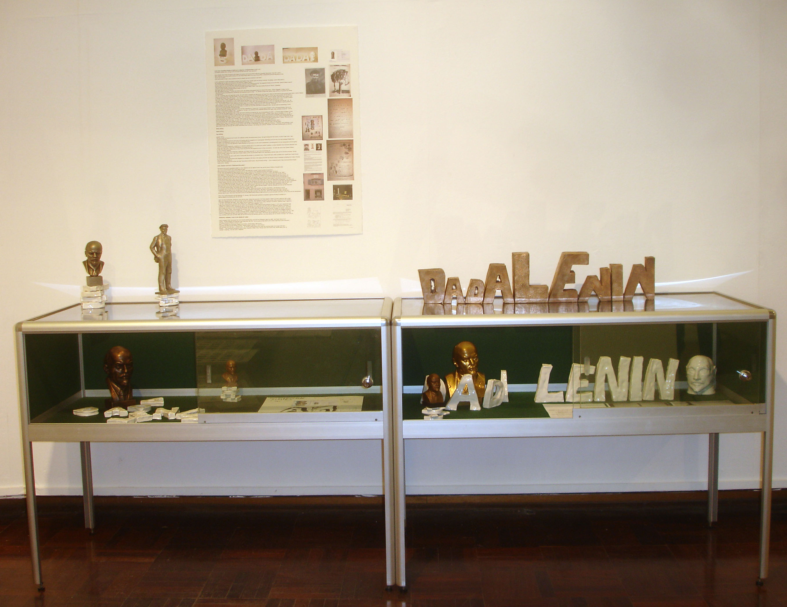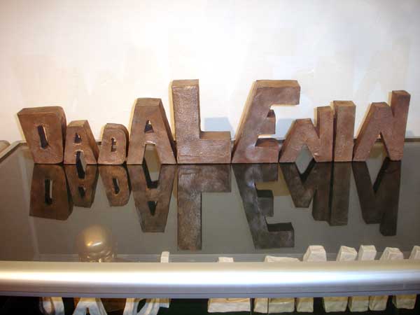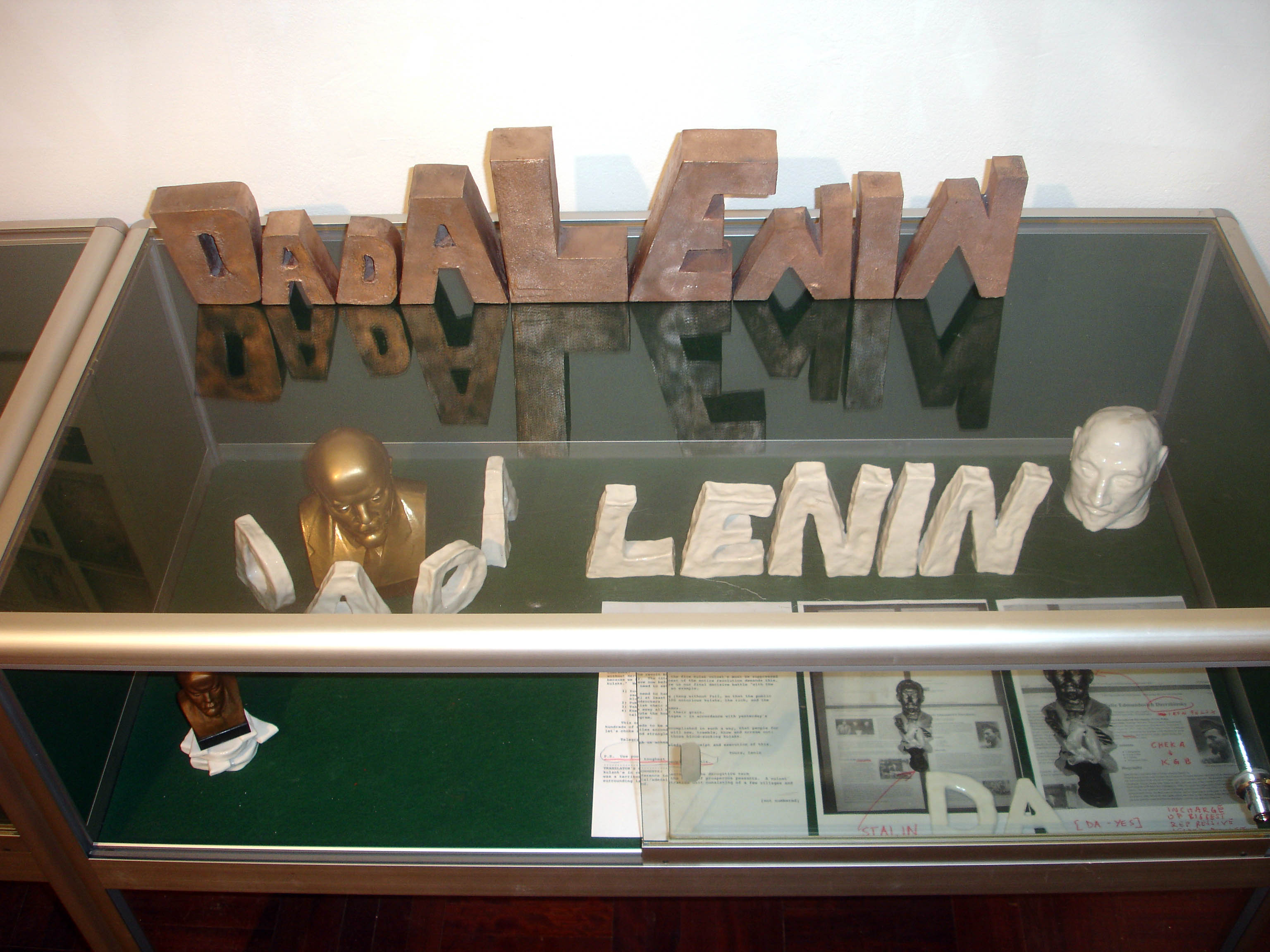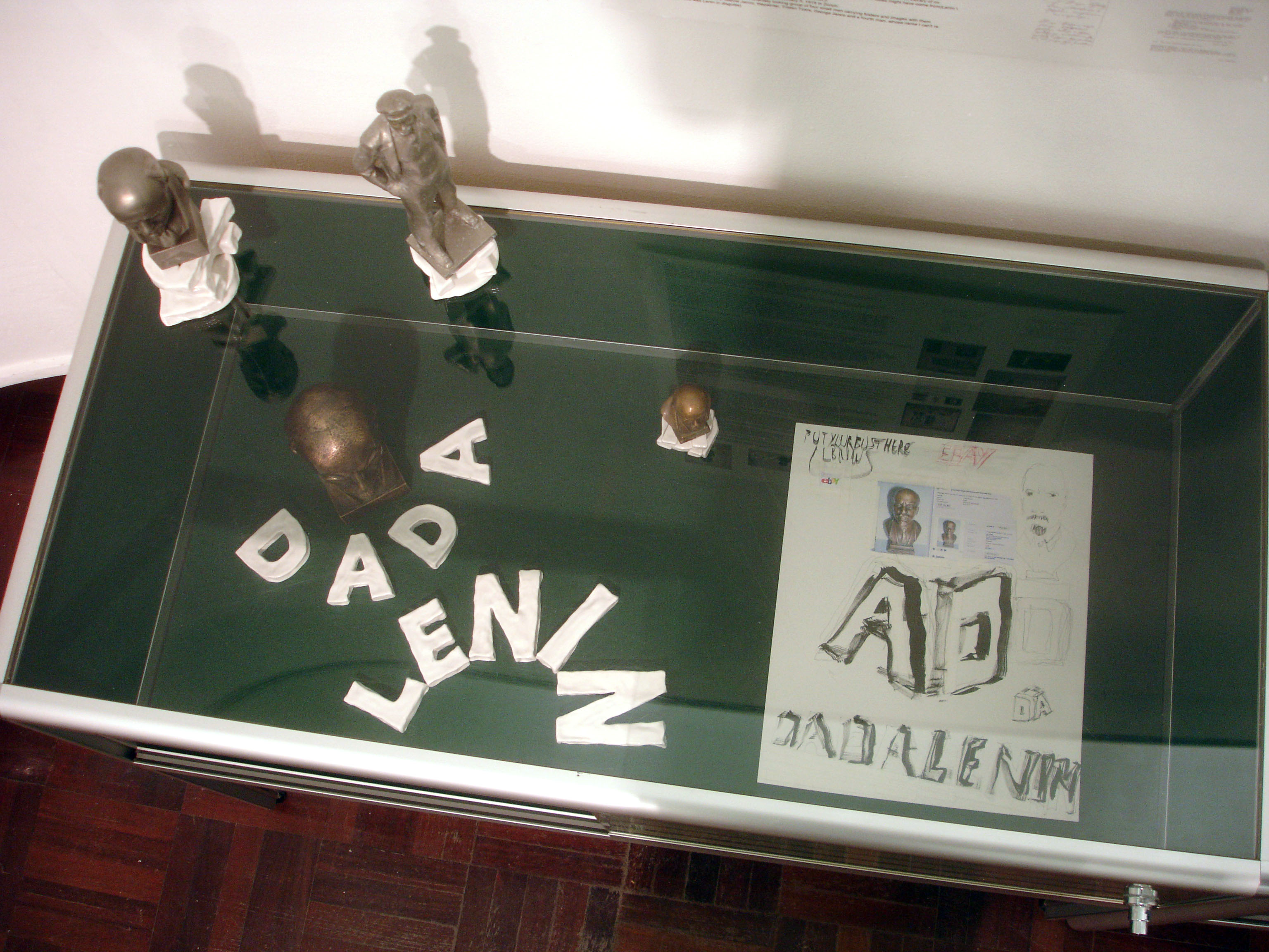 DADALENIN, 2007 (cast bronze, 83 x 18 x 5cm, 2007) iinside vitrine Dadalenin, toal size 15 x 10 x 8cm, metal bust on marble base and porcelain letters - DADA, 2007