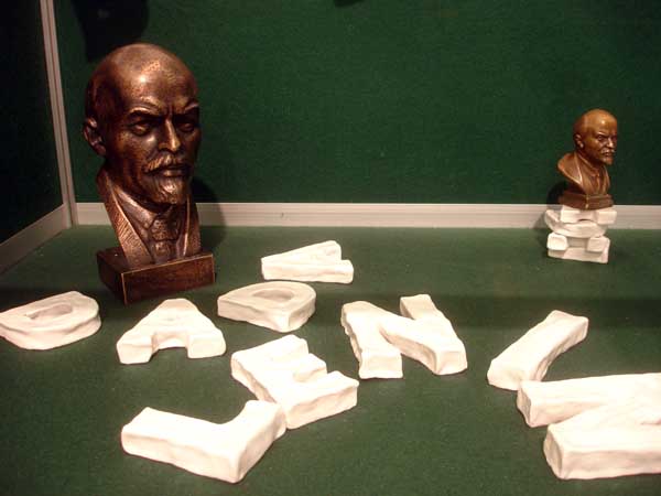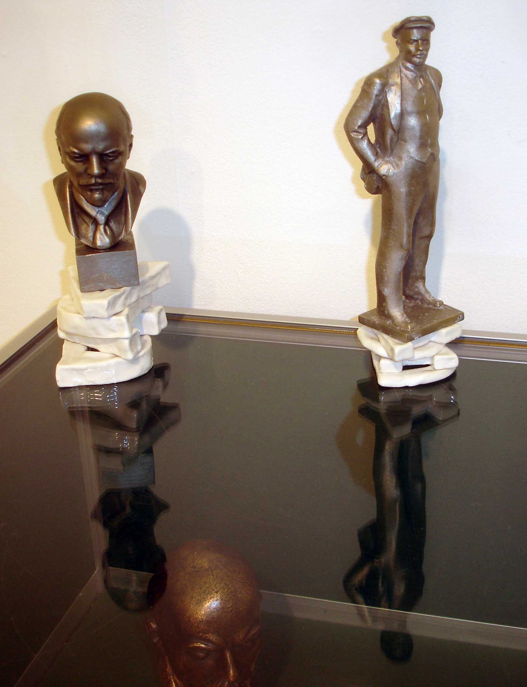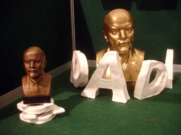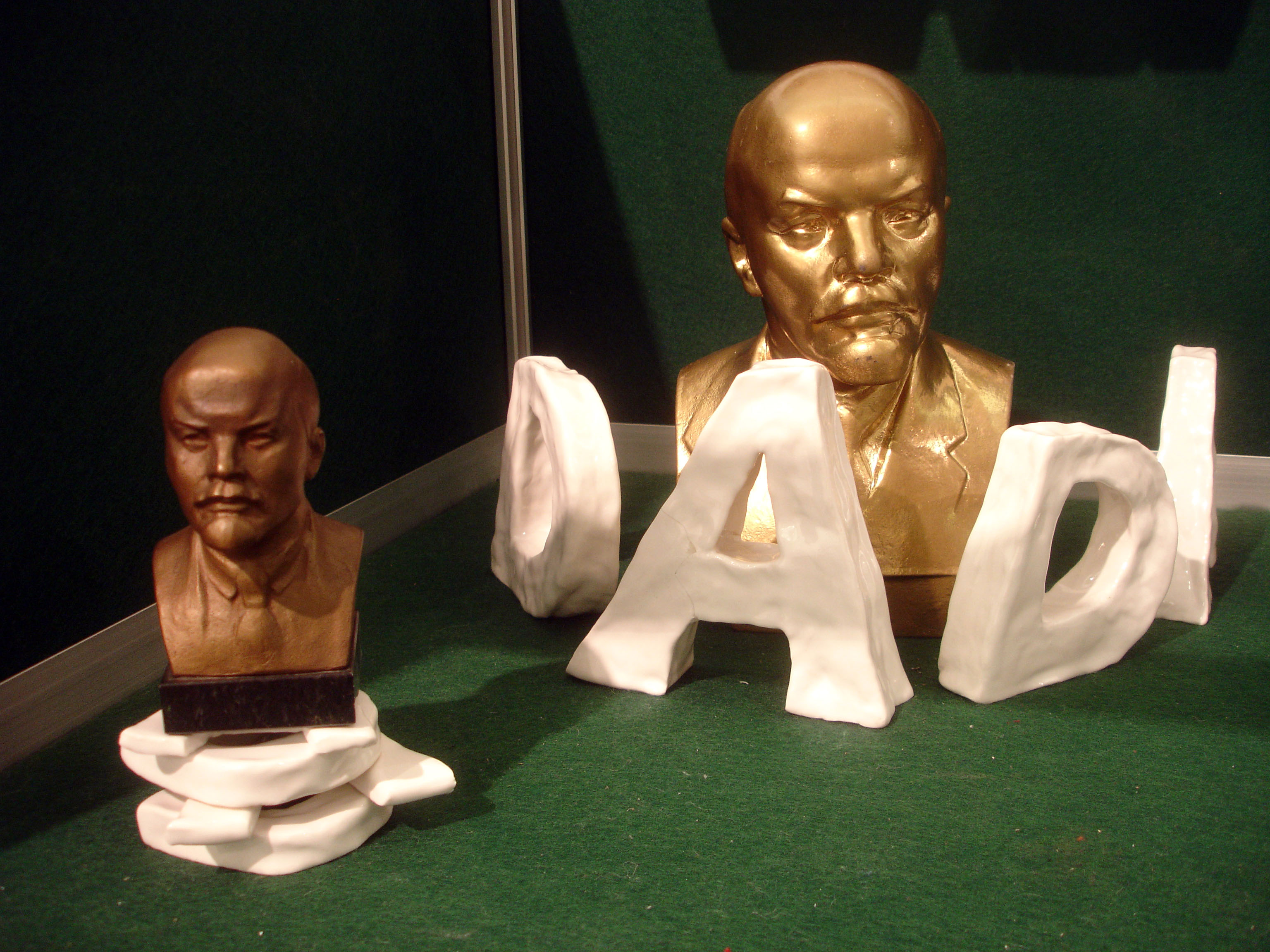 DadaLenin, 2007 (porcelain letters -DADA-, metal bust on marble base) left - total hight: 15 cm , A= 8 x 7.5 . 05 bust: 10 cm high bronze (left sculturep) DadaLenin, 2007 (porcelain letters -DADA-, metal bust) - bust 1950 , 21 x 14 x 11 cm, soviet; A = 12 x 12 x 4 cm (right sculpture