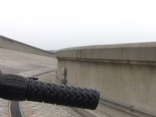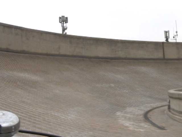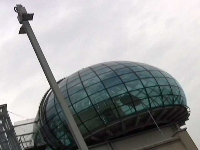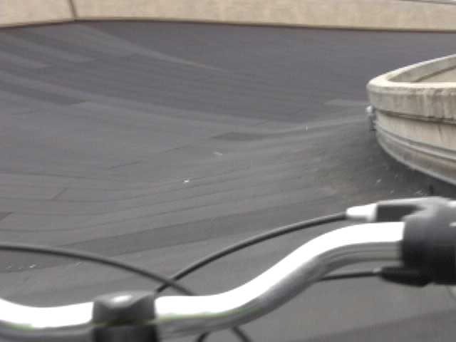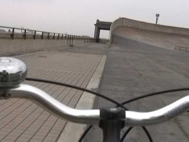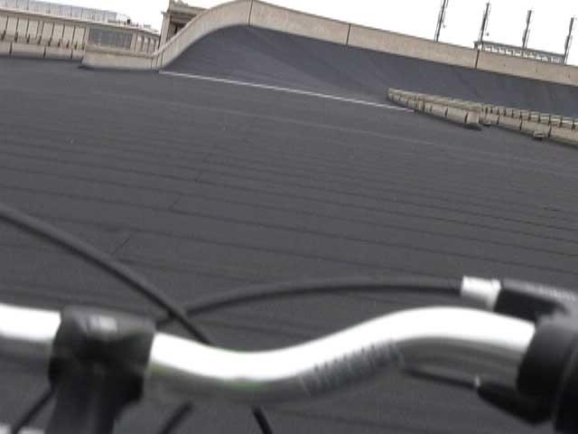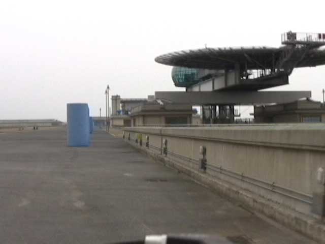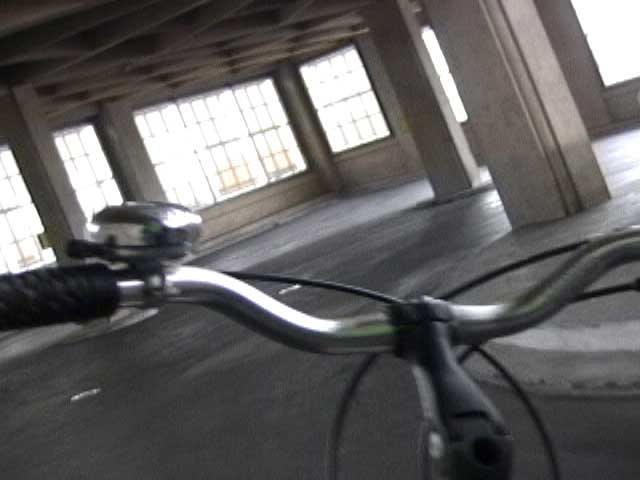 Bicycling FIAT - The Lingotto Fiat Factory 1921 - 2007, Turin 10 min TheLingotto Fiat Factory, build in the 1920s is not only a masterpiece of industrial architecture but also an utopian embracement of car manufactoring in Europe. The factory has a racing course on the roof that was used until the 1980s for testing cars before the factory was decommissioned. Today the factory is a shopping and entertainment center with a hotel and many other facilities, hence in line with the fate of manifacturing in a globalised world. (work is outsourced and workers made into consumers ) "La pista" as it is called in Italian has no particular use and is closed to the public because the racing track is in bad condition. I was able to get access and bicycle several turns to finally decend on the caroussel end of the factory.