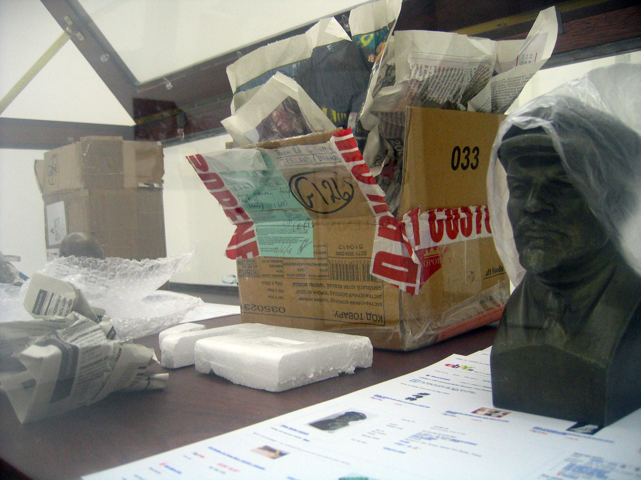 V. I. Lenin, Collected Works, (Russian Edition) 1962, 2007 5 min. video In the European and Russian tradition of book destructions, I am kicking a Russian edition of Lenins collected works accross the Red Square towards the Lenin Mausoleuml, where he still is for view almost daily until 1 pm. This work landed me in the hand and then in the car of the police. I was accused of Holigansim, an accusation that was "forgiven" after a payment of about 150 dollars - so to say, my most expensive taxi ride in Moscow.
