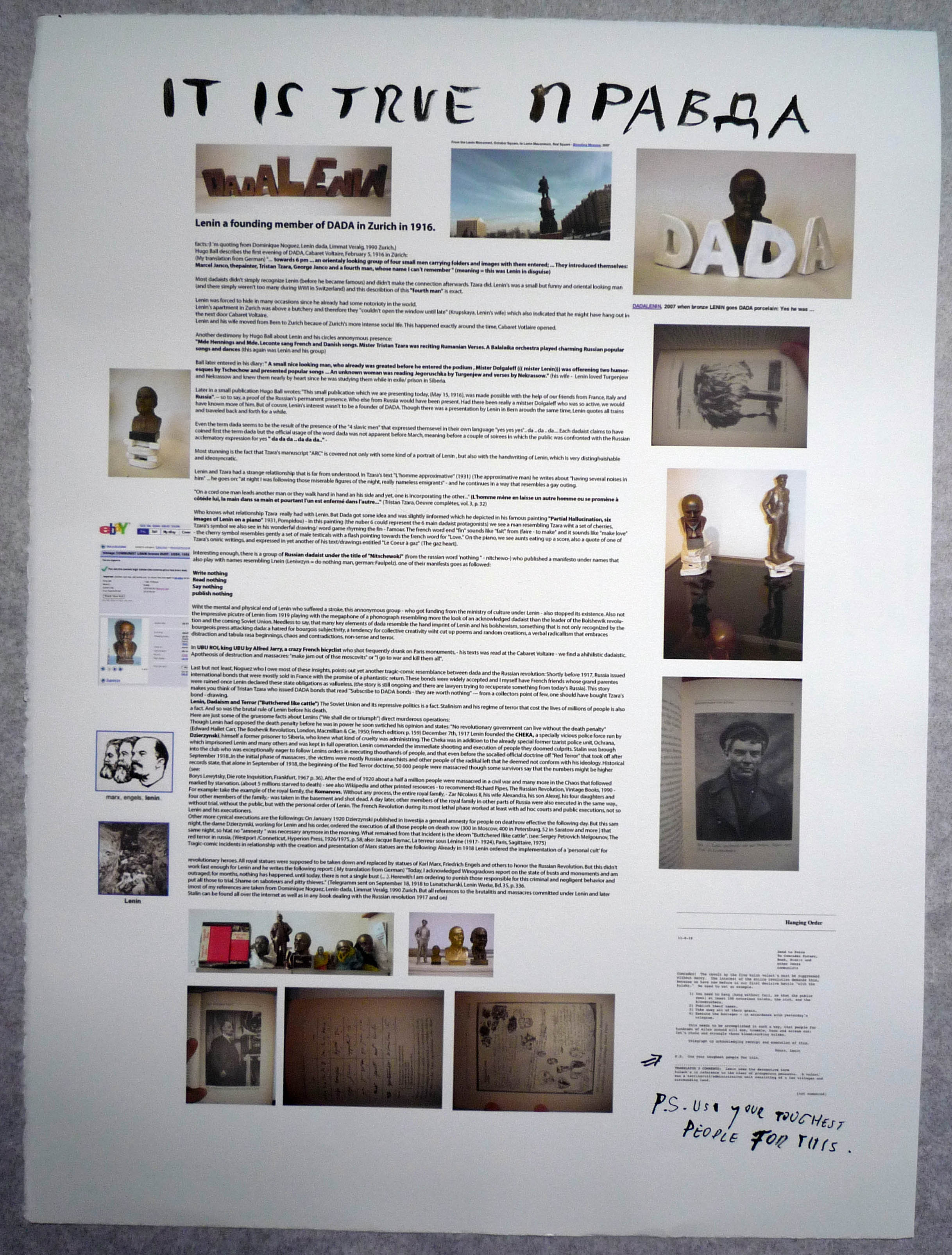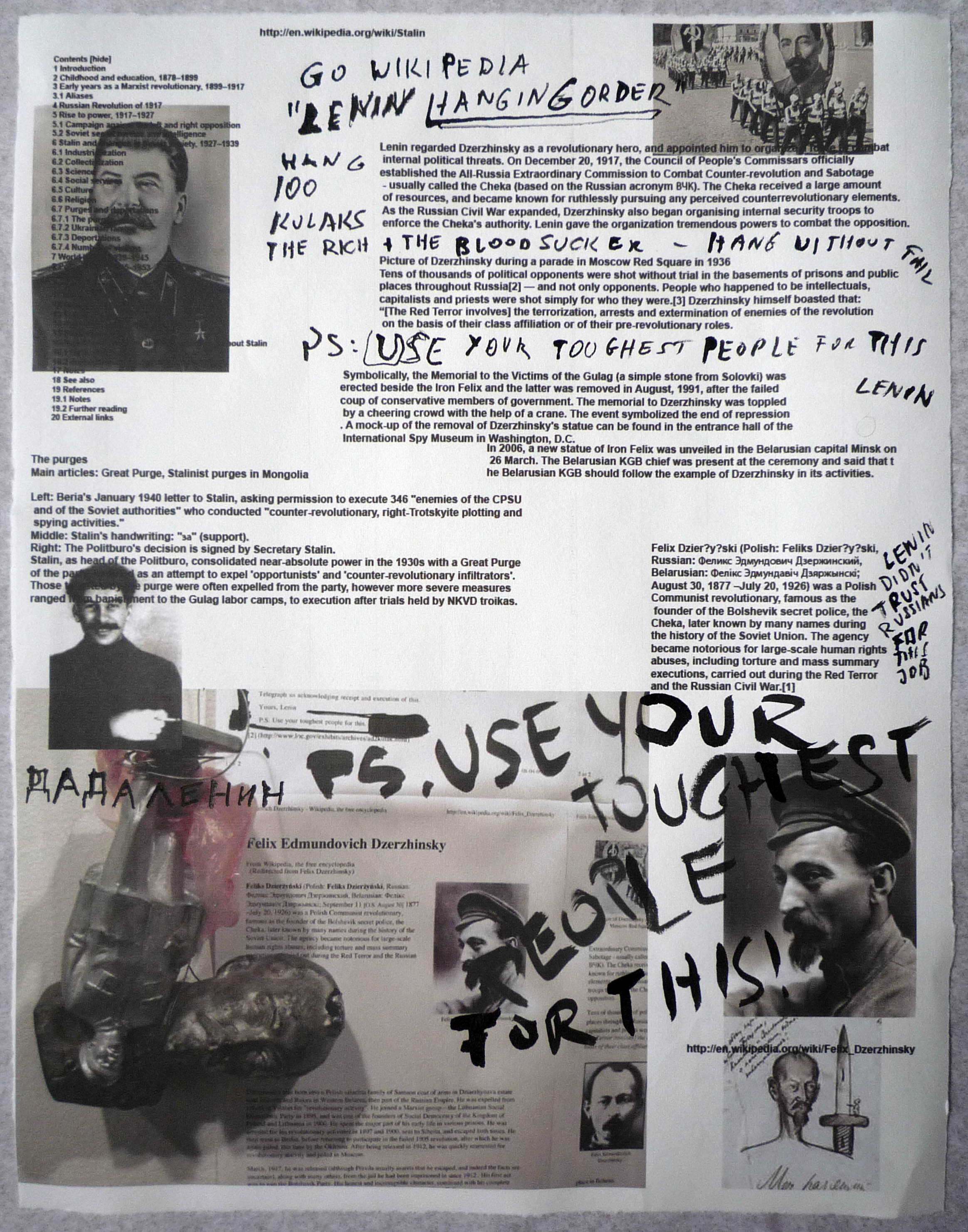 DADALENIN, PS: Use Your Toughest People For This, 2008s ink drawing and print on paper, plus two metal sculputers (Stalin, Dzerhinsky) hanging on a cable (not visible on this picture)
