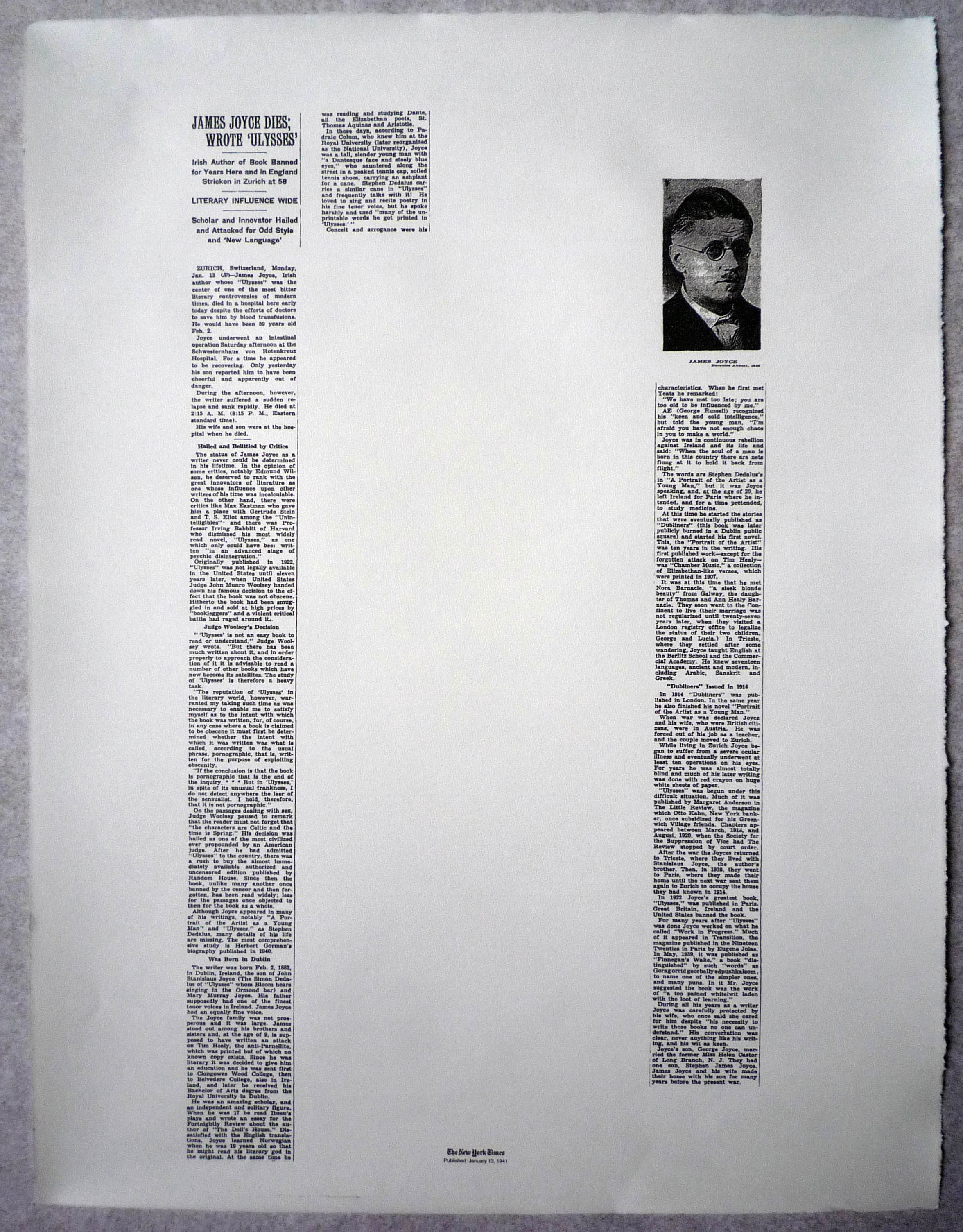 New York Times, Obituary, James Joyce Dies, Wrote "Ulysses", 1/13/1941, 2008 ink jet print on paper, 64 x 48.5 cm / 25 1/4" x 19 1/8 inches