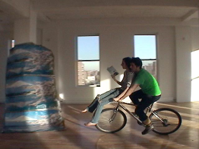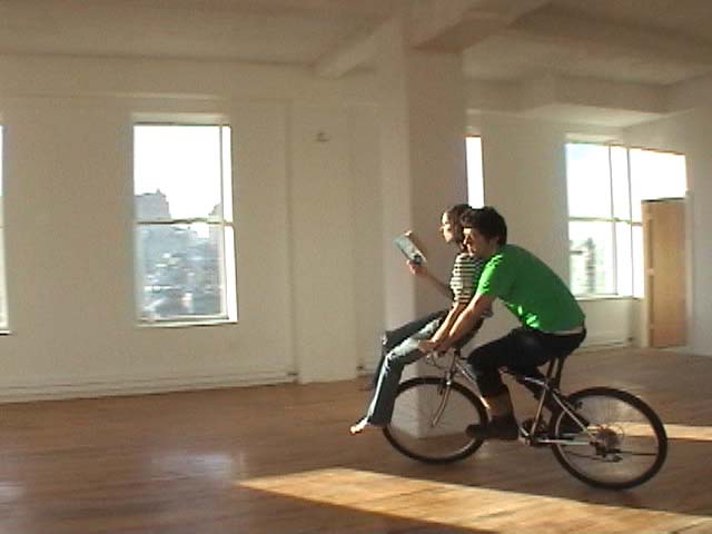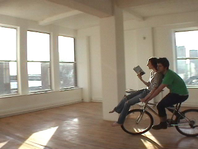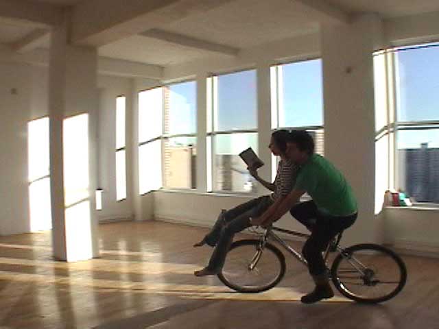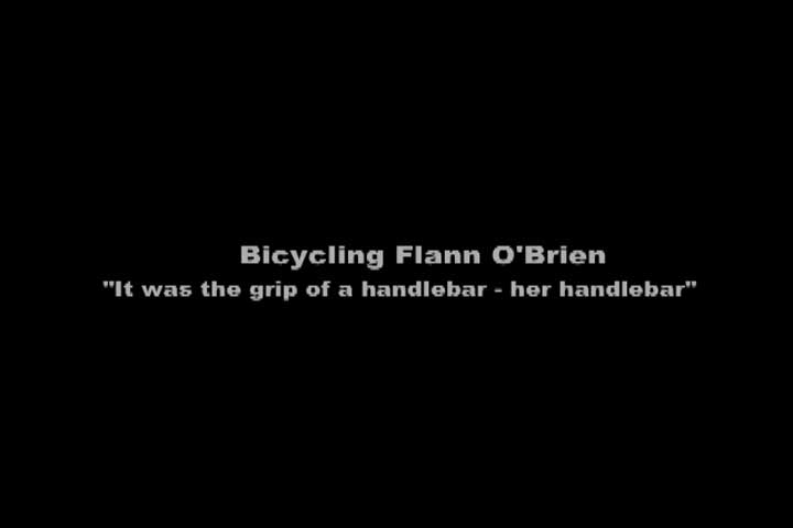 Bicycling Flann O'Brien - "It was the grip of a handlebar - her handlebar" , 2006 video: 12 min streaming - (origianal material in HDV standard - excerpts read by Romana, camera Heidrun Holzfeind 12 min streaming (kamera wihtout external microphone) second version : 2007 - external microphone - camera Rodrigo Mallea Lira) The book "The third police man" by Flann O'Brian is a metaphysical travel on a bicycle through a post-modern murder case with life, memory and houses lost and regained addressing some existentialist questions. For this video, I bicycle in circles in an emptry wonderful lower Manhattan penthouse loft with my girlfriend Romana Rozsypalova reading selected excerpts from the last chapter of this O'Brian's book sitting on the handle bar. In this chapter 12 the author somehow eroticizes the bicycle as the last thing the protagonist seemed to hold on after having lost everything, including his life. As the reader will see, even this bicycle was stolen, gone. And so was his life all along. The text is given below: Only the underlined parts were read but twice in a row.