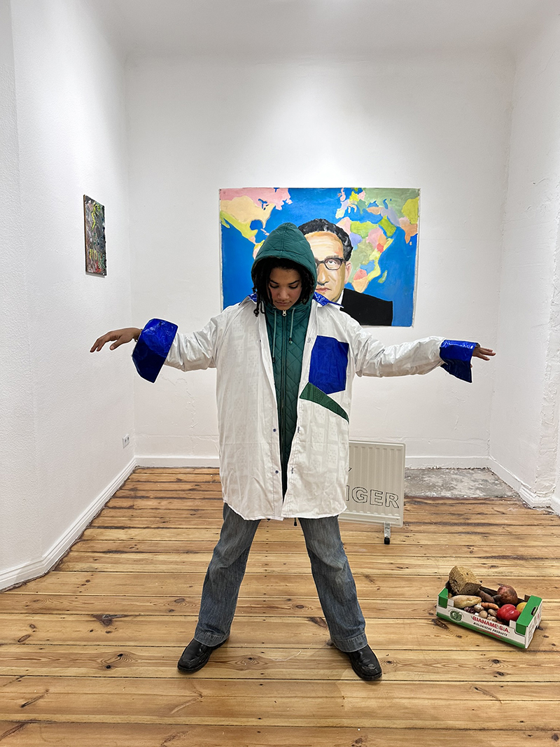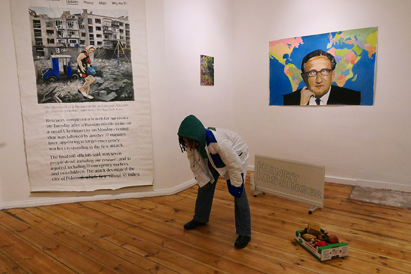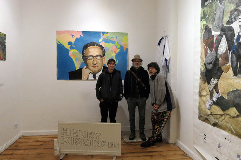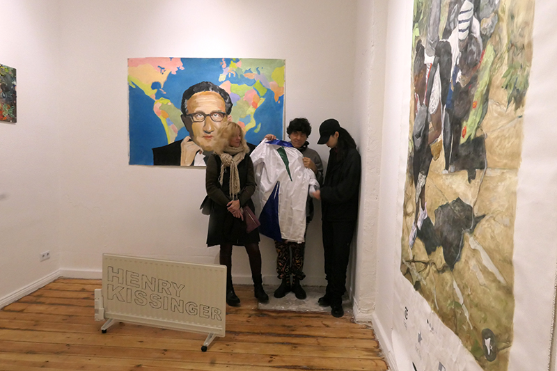 thanks to Fee and Peng Xiangheng for performing in ths show with COMMEDESMARXISTS note the back side of the "recycled" electro radiator as a comment to CLIMATE CHANGE and all the big promises to leave fossile fuels behind. Fee is Swiss and helped us - the artist run gallery DAUMENLUTSCHER - with natural products that are organic and keep us healthy. Her family has also a migration background from Africa, hence doubling up the core message of the show: we are all the same and there is no reason to discriminate anybody as well as we never know who is who. Henry Kissinger is a man who shaped the world as a global world of US hegemony and was rewarded for a peace nobel prize in 1974 for a war in the far East (Vientnam) he helped to start under a presidency that ended in an impeachment hearing and his resignation for the supression of vital documents concerning the war, the brutality and the futility of the war and its coverage. (the subtitle could also be HUNDRED YEARS OF FUEL AND WAR HEGEMONY enforced with all means including brutality, powerty inflicted enslavery and migration with tremendous climate change effects)