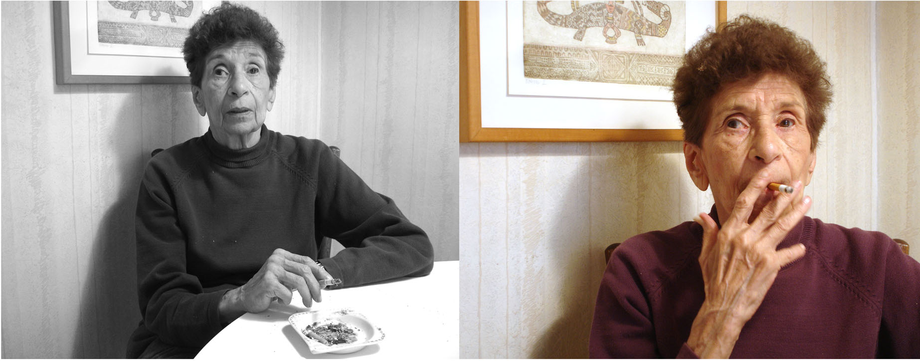 Sprache der Emigration, Ilse Kahane / Language of Emigration, Ilse Kahane, 2005 born: Frankfurt / Main 1925 deported: 1942 to Talin, Estonia follwing camps: Jagula, Reval, Erida, Golofilz, Stutthof, Ocksenzoll/Neungamme, Bergen-Belsen (Liberation 15. April 1945 from Bergen-Belsen) Emigration to New York: 1946 retired: artist apprx. 90 min Video, 8 photographs ( 24 x 20 inches, 61 x 51 cm)
