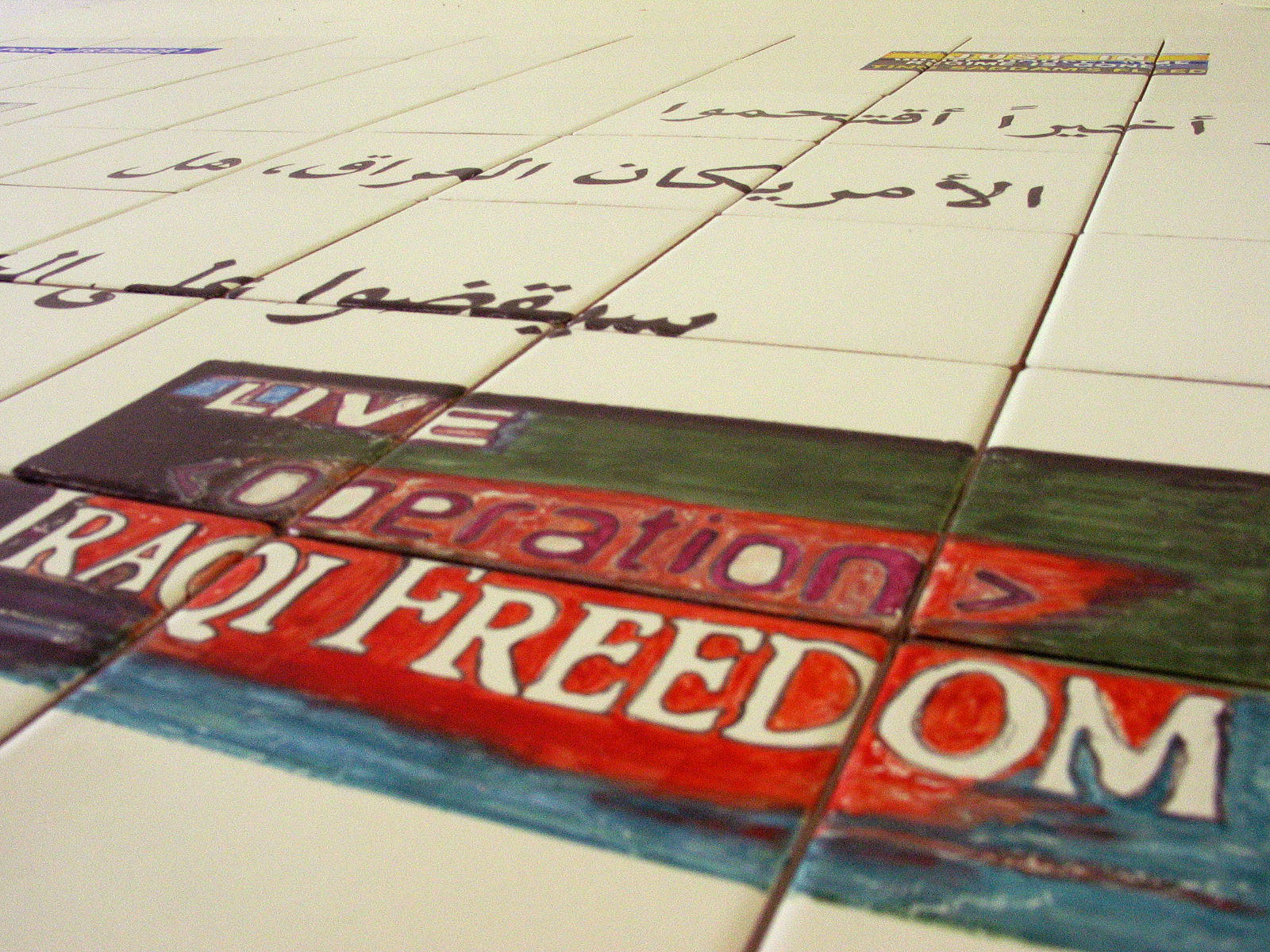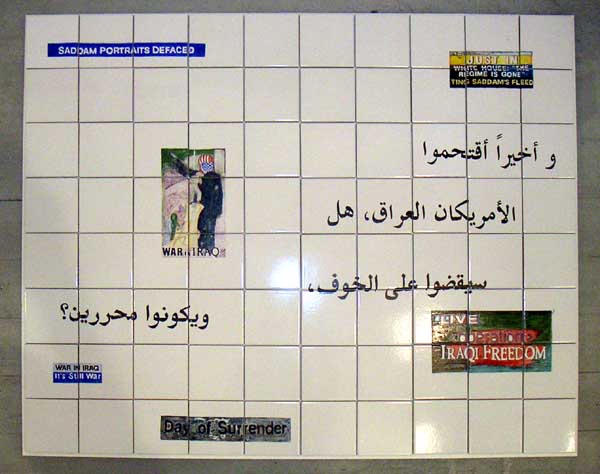 click image to download hi res image IRAQ DIALOG WITH AMER ABBAS, SADDAM PORTRAIT DEFACED, DAY OF SURRENDER, OPERATION IRAQI FREEDOM ... , 2003 Arabic calligraphy and text: Amer Abbas translation by Amer Abbas: Finally, American dared to march into Iraq. Will they bring an end to fear and will they become liberators? Entlich haben es die Amerikaner gewagt, in den Iraq zu marschieren. Werden sie die Zeit der Angst beenden und Befreier werden? ceramic tiles, fired, 80 x 100 cm Amer Abba was born in Baghdad and left many years ago. He founded and runs KUNSTBUERO the gallery I am showing this work.