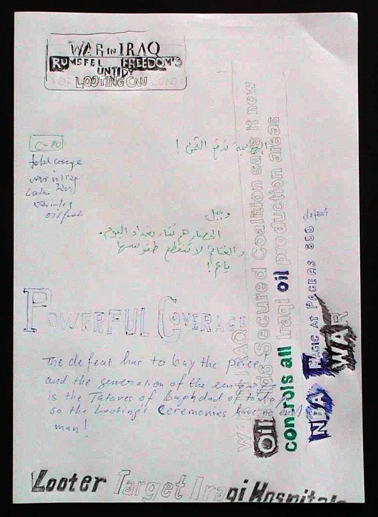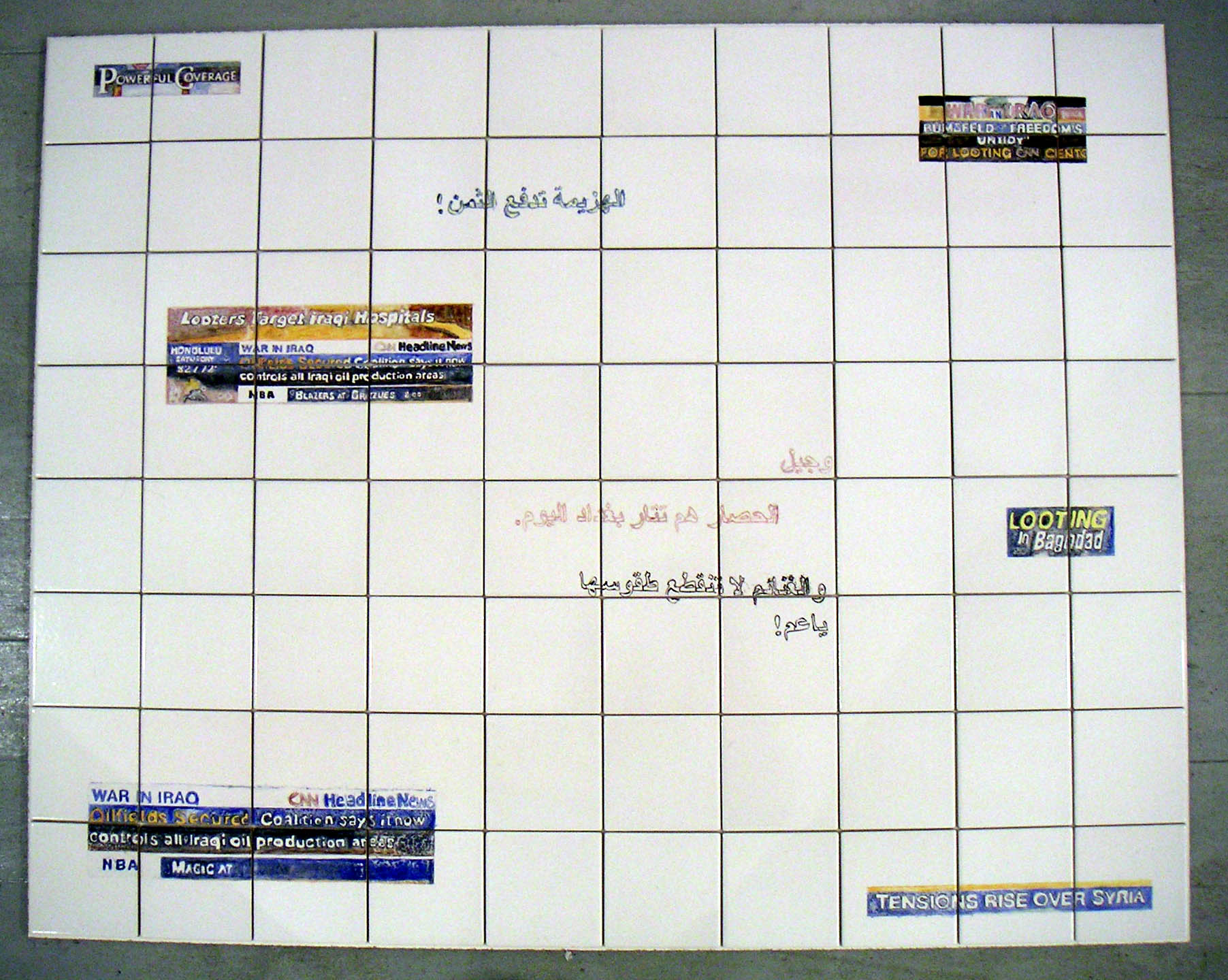 click image to download hi res image IRAQ DIALOG WITH AMER ABBAS, POWER COVERAGE, LOOTING, WAR IN IRAQ ..., 2003 Arabic calligraphy and text: Amer Abbas translation by Amer Abbas: What is the price of defeat? The children of the embargo are today the tatars of Baghdad. german: Was ist der Preis der Niederlage? Die Kinder von dem Embargo sind heute die Tartaren von Baghdad. ceramic tiles, fired, 80 x 100 cm (C) click image to download hi res image IRAQ DIALOG WITH AMER ABBAS, POWER COVERAGE, LOOTING, WAR IN IRAQ ..., 2003 Arabic calligraphy and text: Amer Abbas translation by Amer Abbas: What is the price of defeat? The children of the embargo are today the tatars of Baghdad. german: Was ist der Preis der Niederlage? Die Kinder von dem Embargo sind heute die Tartaren von Baghdad. work on paper, A4 (approx. 21 x 29 cm)x