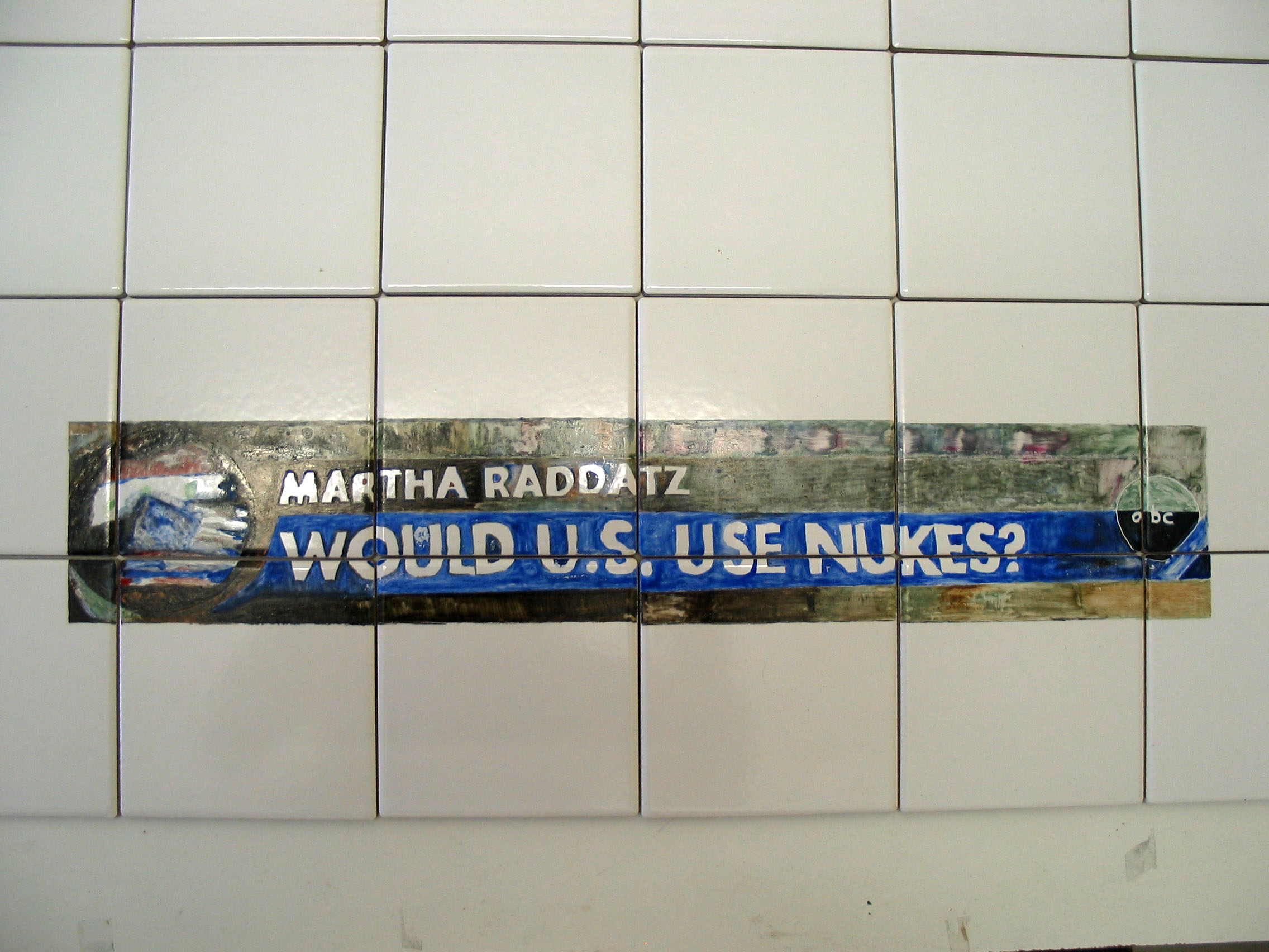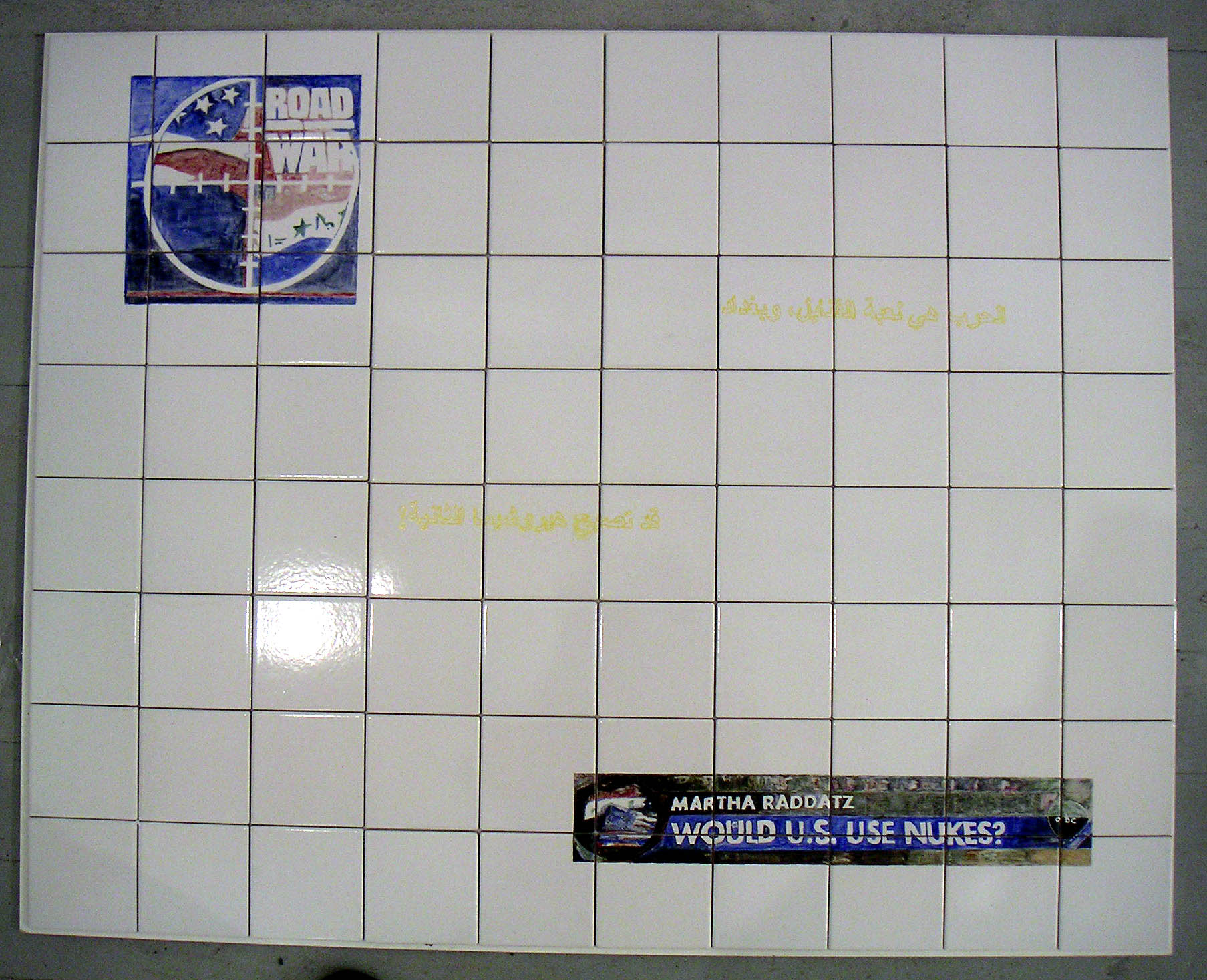 click image to download hi res pict. IRAQ DIALOG WITH AMER ABBAS, ROAD TO WAR, WOULD U.S. USE NUKES?, 2003 Arabic calligraphy and text: Amer Abbas translation: The war is a game of bombs, so Baghdad could be the next Hiroshima ceramic tiles, fired, 80 x 100 cm (B) click image to download hi res image