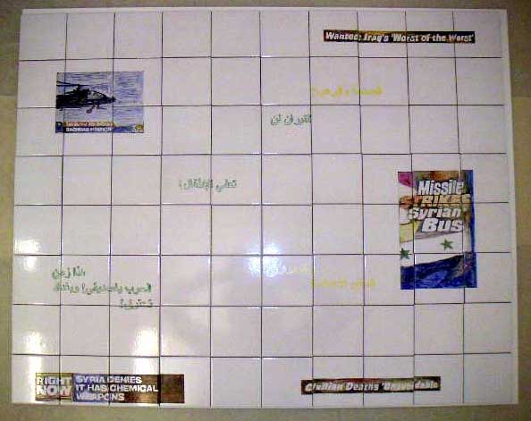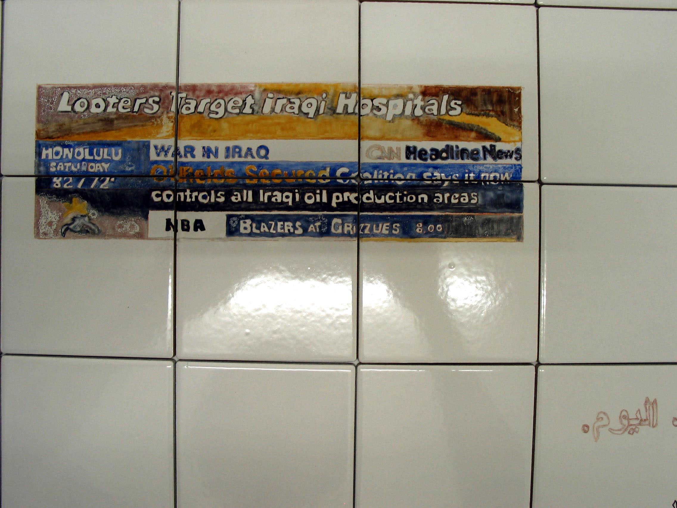 IRAQ DIALOG WITH AMER ABBAS, WANTED IRAQ'S "WORST OF THE WORST', MISSILES STRIKES SYRIAN BUS ... 2003 arabic calligraphy and text: Amer Abbas translation: Shock and awe, the bomb fire will not exceplt children. rockets choose their targets on their own. These are the times of war, my friend. Schock und Erstaunen; das bombenfeuer wird die kinder nicht schonen. die raketen wählen selber ihre ziele. dies sind di e zeiten des krieges, mein freund. ceramic tiles, fired, 80 x 100 cm (A)