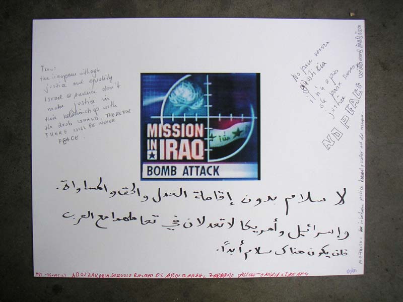 Production: Amaze, Milano with the generous help of Forme 2000, Sassuolo and VIVA, Sassuolo. calligraphy Siyam Mohsen, graphics: Siyam Mohsen and Silvano Rutigliano click image to download high resolution printable image: ARAB DIALOG WITH ADIL ASSOUSS, POSTWAR DANGERS, MILITARY RESPONSE, 2003 Translation by Siyam Mohsen: Whatever the conflicts between nations, children and civilians are innocent ... therefore the United Nations shoud punish any soldier who kills a civlian or a child. Size: 160 cm x 250 cm x 1 cm materials: ceramic tiles: 80 individual pieces, certificate of authenticity