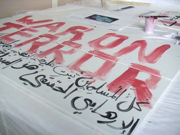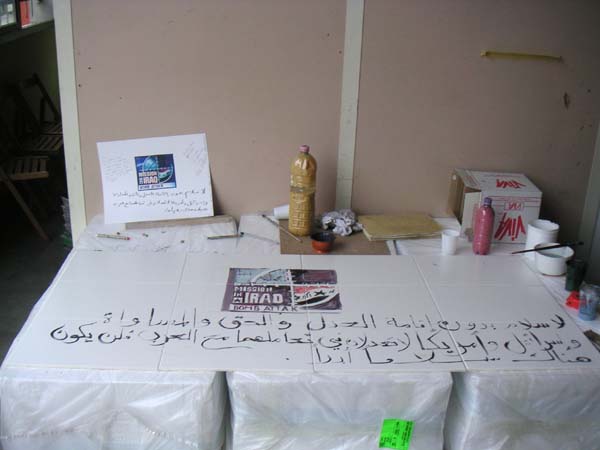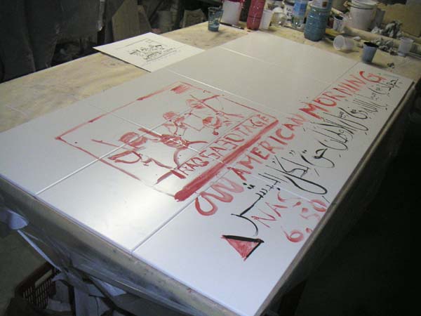 click image to download 3.2 mb image: (L) ARAB DIALOG WITH ALI -- , BAGHDAD FIREFIGHT, COMPLETE COVERAGE, 2003 Arabic text: Ali; calligraphy and graphics: Siyam Mohsen Translation by Siyam Mohsen: The war against Iraq initiates the war against all Arabs. Size: 160 cm x 250 cm x 1 cm, materials: ceramic tiles: 80 individual pieces, certificate of authenticity Ali preferred not to give his full name. He is from Morocco and works in a ceramic factory in Sassuolo.