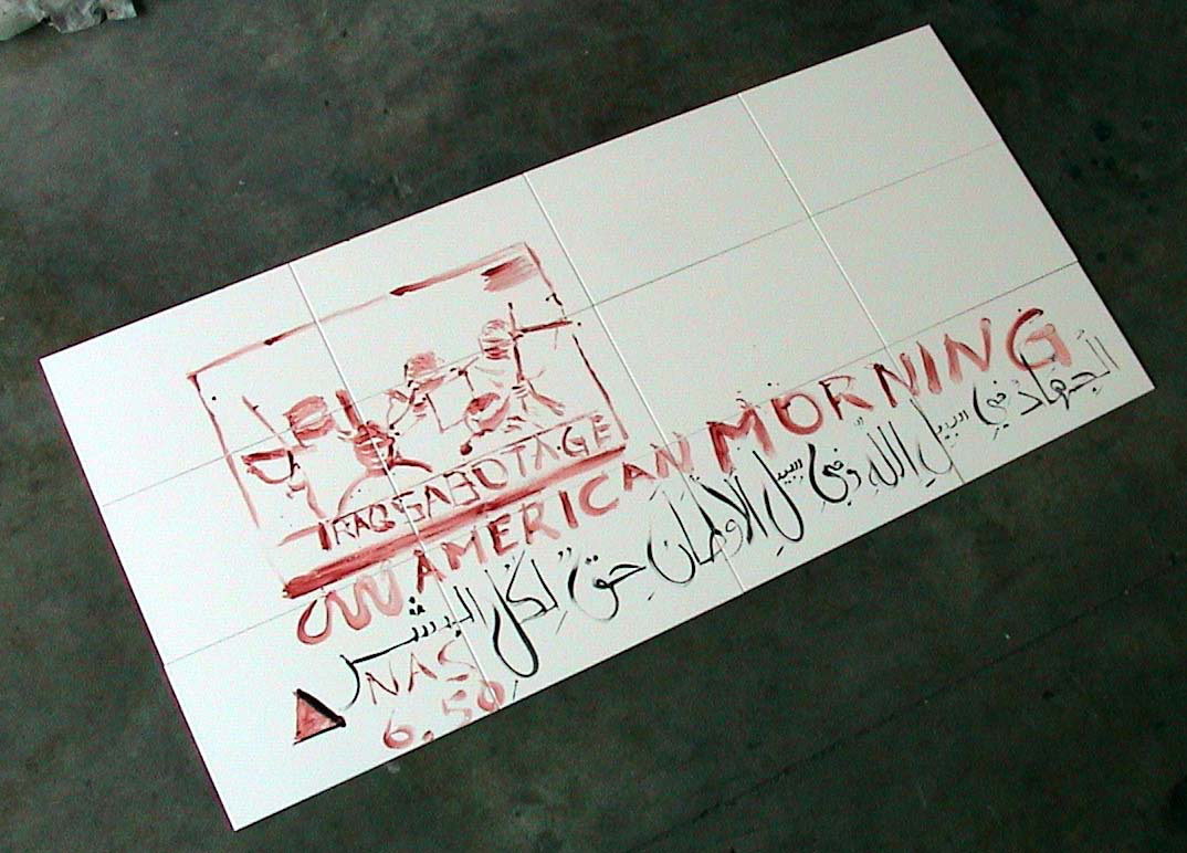 (UI) click here to download ARAB DIALOG WITH SIYAM MOSHEN, CNN, IRAQ SABOTAGE, AMERICAN MORNING, 2003 Arabic text, calligraphy: Siyam Mohsen; graphics: Rainer Ganahl Translation by Siyam Mohsen: Fightin in the name of god and for oneÕs nation is the right for every human being Size: 75 cm x 160 cm x 1 cm, materials: ceramic tiles: 12 individual pieces of 25 x 40 , certificate of authenticity Siyam Mosen is an architect, an artist, a calligrapher and cultrual and linguistic mediator. He was born in Palestine and moved to Sassuolo many years ago. click image to dwonload