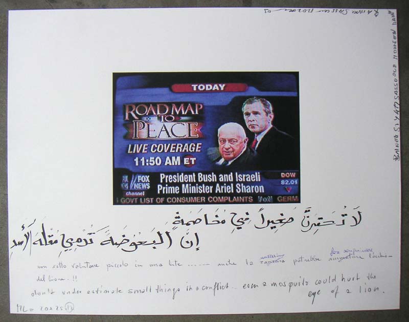 click image in order to a get high res image: (M) ARAB DIALOG WITH SIYAM MOHSEN, CNN, THE MOST TRUSTED NAME IN NEWS, 2003 Calligraphy Siyam Mohsen, graphics: Silvano Rutigliano Translation by Siyam Mohsen: Snow melts if you will see what appears underneath. Size: 160 cm x 250 cm x 1 cm Siyam Mosen is an architect, an artist, a calligrapher and cultrual and linguistic mediator. He was born in Palestine and moved to Sassuolo many years ago.