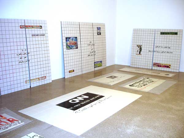 AFGHAN DIALOGS - silk embroideriesIRAQ DIALOGS - fired ceramic tilesARAB DIALOGS - fired ceramic tilesNEWS PAINTINGS - Acrylic on canvasBICYCLING DAMASCUS - videoHOMELAND SECURITY - videoINSTALLATION VIEWS - installation views