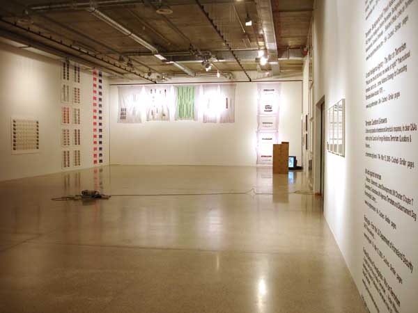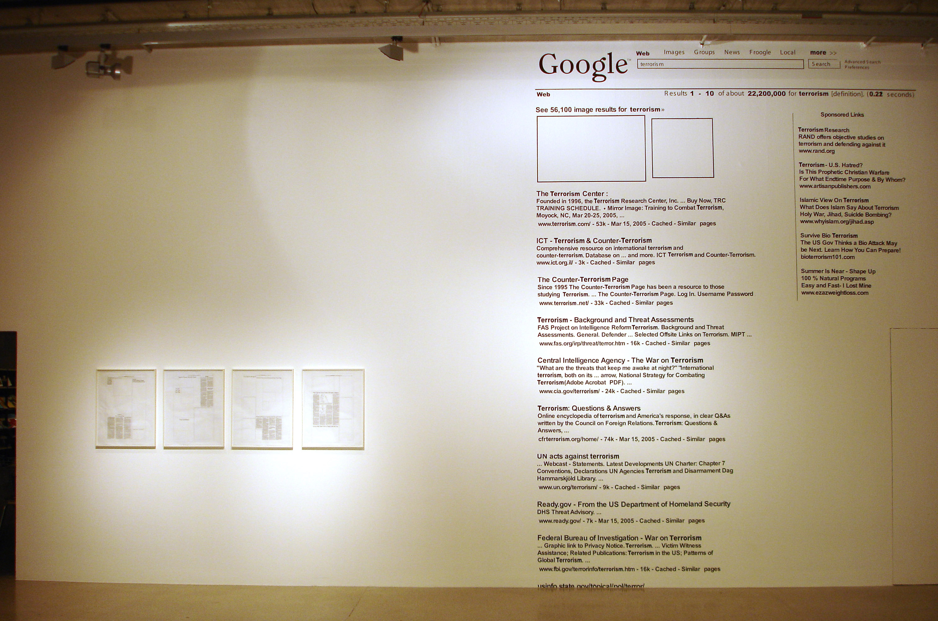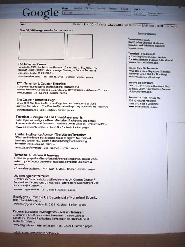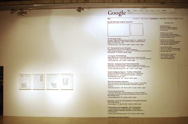 clickimagess for hi-res pictures Searching "Terrorism" on Google.com - wall painting This work is line of my series of wall paintings that I started in 1989. Electronic search machinese are not only emblematic for the current and future frontiers in digital technology, our bureaucratic world, but also on the end of security and in the "big brother industry." Exporting - the proper word in computer lingo - digital interface content into actual space - or itno book format or yet others -- renders the organizational principla more visible and gives an interesting spin to the the real meaning of architectonic space - which is by essence also nothing else but a result of definitions and legal renderings (whether residential, industrial, corporate, tourist, cultural etc. )