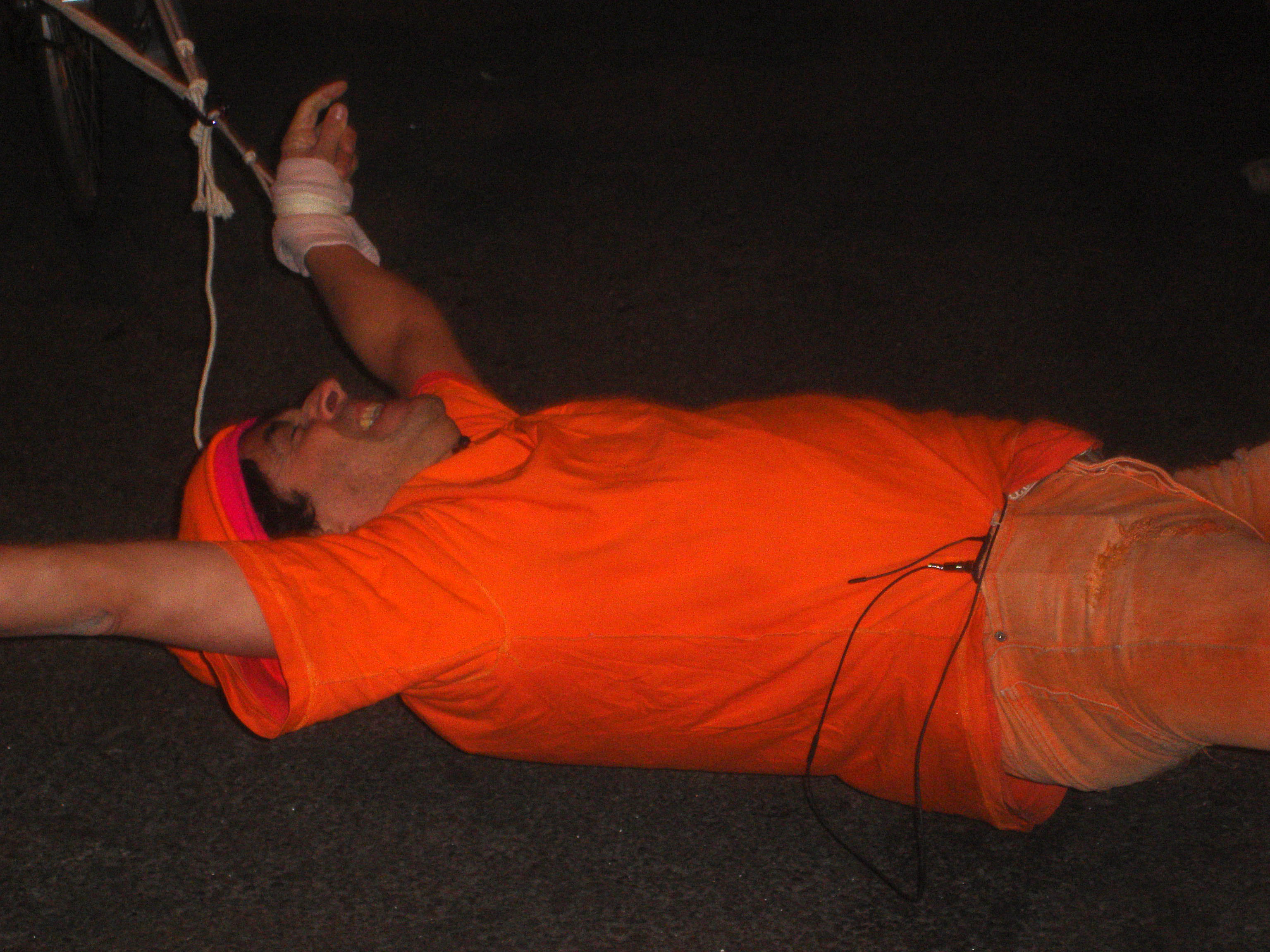 Rainer Ganahl, Bicycle Quartering, 1757/2007 performance "Finally, he was quartered, ... this last operation was very long, because the horses used were not accusmed to drawing; consequently, instead of four, six were needed; and when that did not suffice, they were forced, in order to cutoff the wretch's thighs, to sever the sinews and hack at the joints ..." Gazette d'Amsterdam, 1757 in: Michel Foucault, Discipline @ Punish, The Birth of the Prison, 1977 For this performance, I was attached by rope to four or eight or even twelve bicycles which were trying to pull me into four pieces in the middle of a street crossing in downtown Manhattan blocking car traffic for a couple of mintues. This should be a reminder that torture is practiced today by the current Bush administration in relationship to their “war on terror” over resources that wouldn’t be needed if people used bicycles and not cars. Performance site: intersection Stanton and Eldrige Street, Manhattan, November 16th, 2007 from 9 30 pm This was part of PERFORMA 2007 / IN THE CONTEXT OF SNÖRFRIED