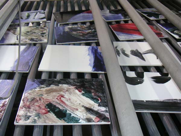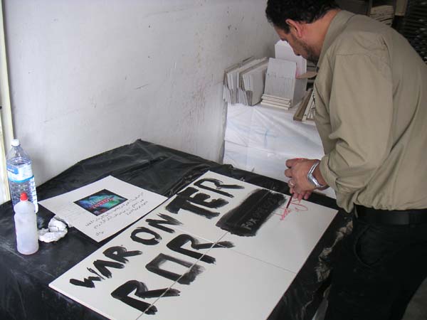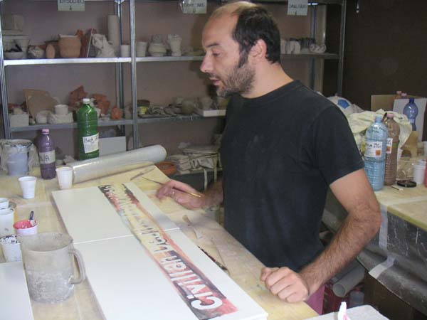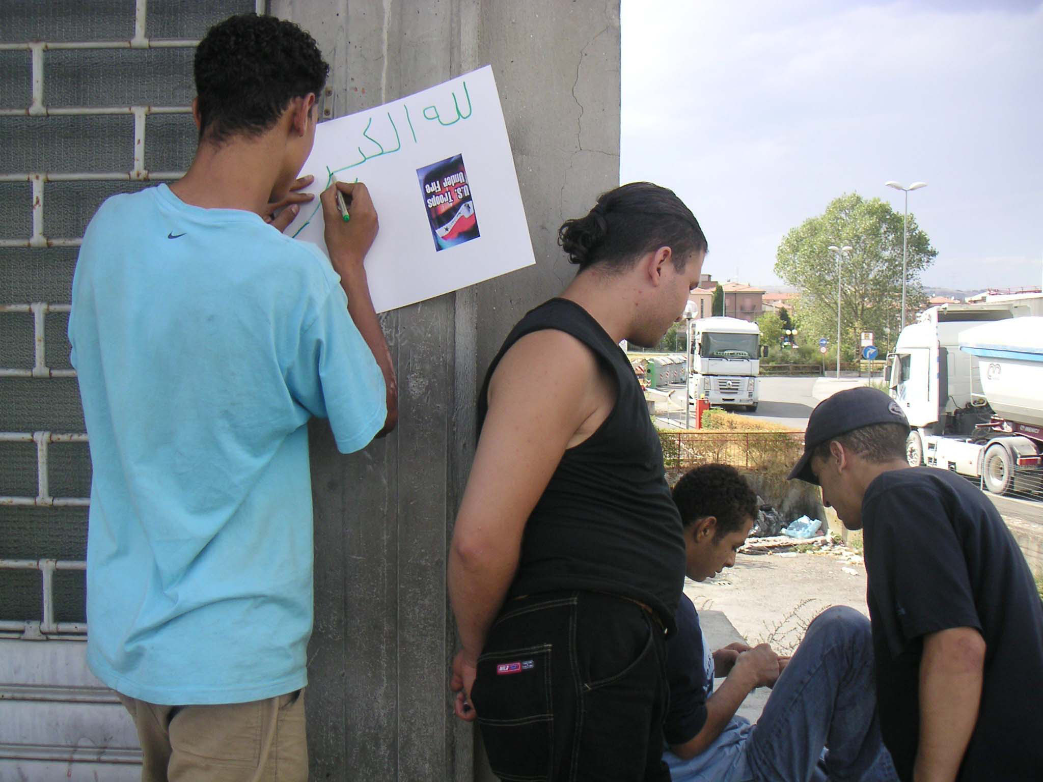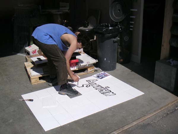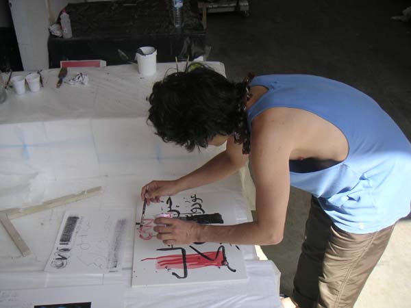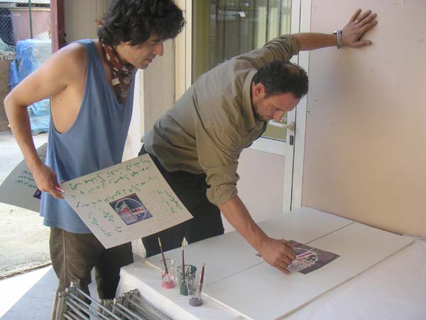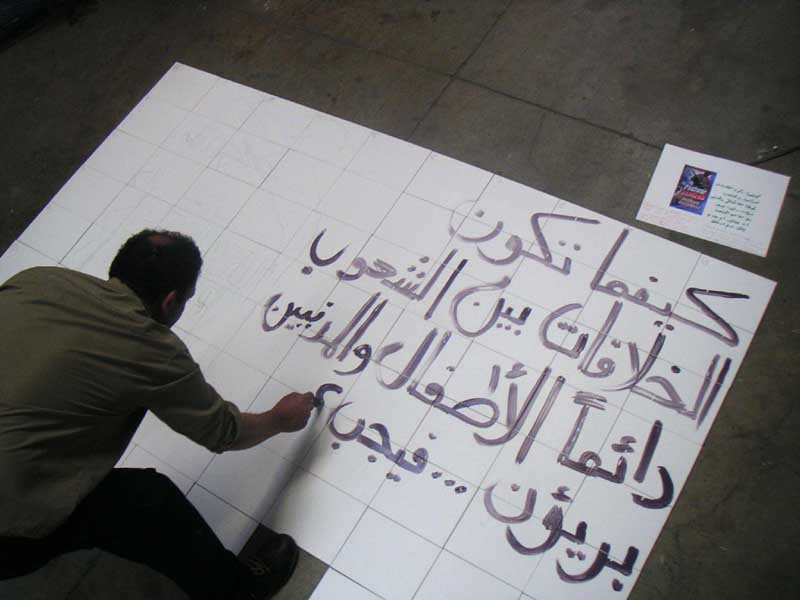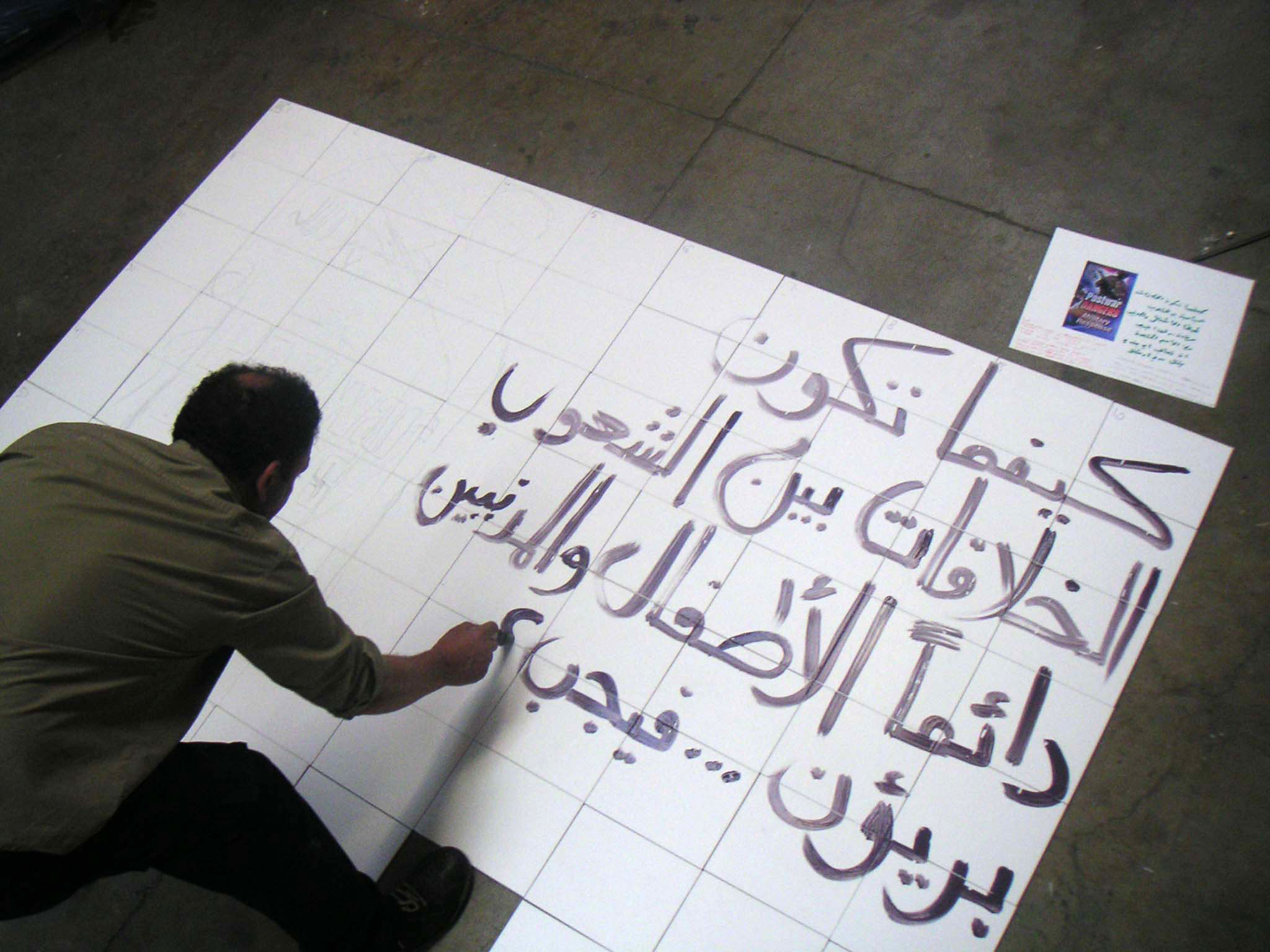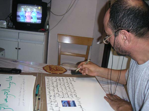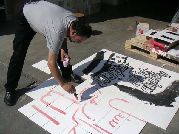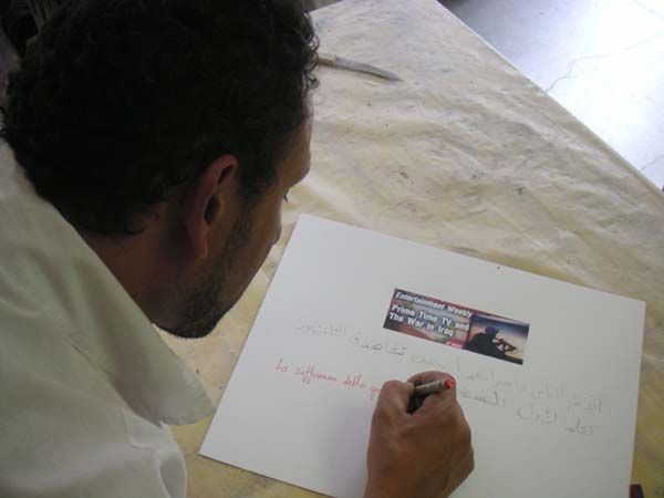 SASSUOLO AND MODENA ARE THE EPICENTER OF CERAMIC PRODUCTION IN EUROPE. MANY ARAB PEOPLE FROM NORTHERN AFRICA AND THE MIDDLE EAST ARE WORKING IN THESE GIGANTIC CERAMIC FACTORIES AS "EXTRACOMMUNITARI" - PEOPLE FROM OUTSIDE THE EUROPEAN COMMUNITY - ALSO REFERED TO AS "ISLAMISTI" - ISLAMISTS. I WAS INVITED BY CLAUDIA ZANFI AND MARCO SCOTINI FOR THIS EXHIBITION/EVENT: GOING PUBLIC ORGANIZED IN CONJUNCTIONWITH THE CITY OF SASSUOLO. MANY THANKS GO TO ALL THE ARABIC PARTICIPANTS FROM TUNESIA, MAROCCO, AND PALESTINA, MOSTLY CERAMIC WORKERS WORKING AND LIVING UNDER RATHER HARD CONDITIONS IN SASSUOLO. THANKS ALSO TO MY GREAT ASSISTANTS: SIYAM MOHSEN FROM PALESTINA, NOW LIVING NEAR SASSUOLO AND SILVANO RUTIGLIANO FROM SASSUOLO. SPECIAL THANKS ALSO TO FABRIZIO ZANFI WITH HIS TILE FACTORY VIVA PROVIDING GENEROUSLY US WITH THEIR FINE MATERIALS AND TO DARIO BRUGIONI AND HIS FORME 2000 WHO LET US USE HIS MAGIC CERAMIC HIGHWAY OVENS AS WELL AS HIS GENEROUS ASSISTANCE WITH COLORS, LOGISTICS AND SPACE. concept: My concept for this body of works consists in the exchange of ideas and opinions about the crisis in Iraq and the Middle East with Arab workers here in Sassuolo. I try to create a dialog platform to express other peopleÕs thinking and feelings about politics as well as about their personal and collective history. Dominant and typical U.S.news material concerning the Arab world were presented to participants first. I asked them, to respond in Arabic. With their agreement the results have been painted on ceramic tiles. Tiles are often used in public places in the Arab world. They are indefinitely durable and don't fade though at the same time, they are very fragile and can be easily broken. They also are the site of early writings. They are similar to stones and carry as such meaning in the current Middle East conflict. Some of the graphic elements were painted by me, others were painted by my assistants Sylvano and Siyam. You will recognize the difference quickly since I do not have any training or experience in brush practices. Each person participating in the dialog is asked to give his/her own response, opinion and position seeing these media fragments usually associated with US-news reporting. Encouraging my partners to express themselves freely in regards to politics and its relationship to powerful media interfaces is the main part of my conceptual goal. These news elements seem to be selling, branding, justifying, authenticating and even cheerleading news content and in this case a varity of conflicts that very strongly devides internatinal public opinions and the current US goverment under George.W Bush. Therefore, I am interested in recontextualizing this tv-material differently, using it in relationship with people who are directly affected by these confrontations asking them to "write back." All the sentences written in Arabic are entirely conceived by my dialog partners and don't show any input by me! In now way did I try to influence or censor these responses. They are entirely their views and statements. I WOULD LIKE TO MAKE IT CLEAR THAT THE OPINIONS EXPRESSED BY MY DIALOG PARTNERS ARE NOT AUTOMATICALLY SHARED BY ME. I DO NOT TAKE ANY RESPONSIBILITY FOR WHAT MY DIALOG PARTNERS EXPRESS. THIS WORK IS NOT INTENDED TO BE A PLATTFORM FOR ANTI-AMERICANISM OR ANTI-SEMITISM BUT FOR DIALOG AND OPPOSING VIEWS EXPRESSED BY PEOPLE MOST CONCERNED ABOUT IT.