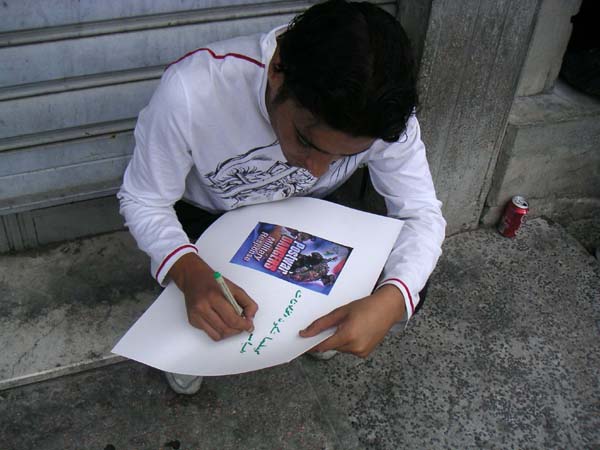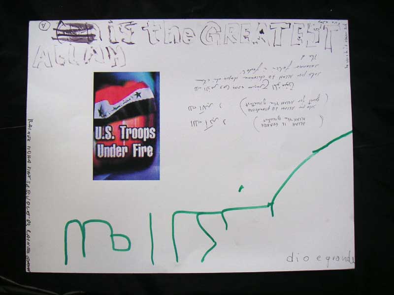 This young man is from Tunesia. I don' t want to identify him, since he advocates war against the USA. We did not use this sentence because we don't want to incite hatred or violence. We used the image otherwise and Siyam Moshen wrote another response. see next page: Siyam also refused to transcribe his text.