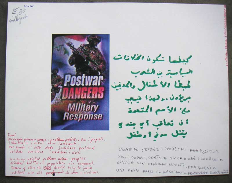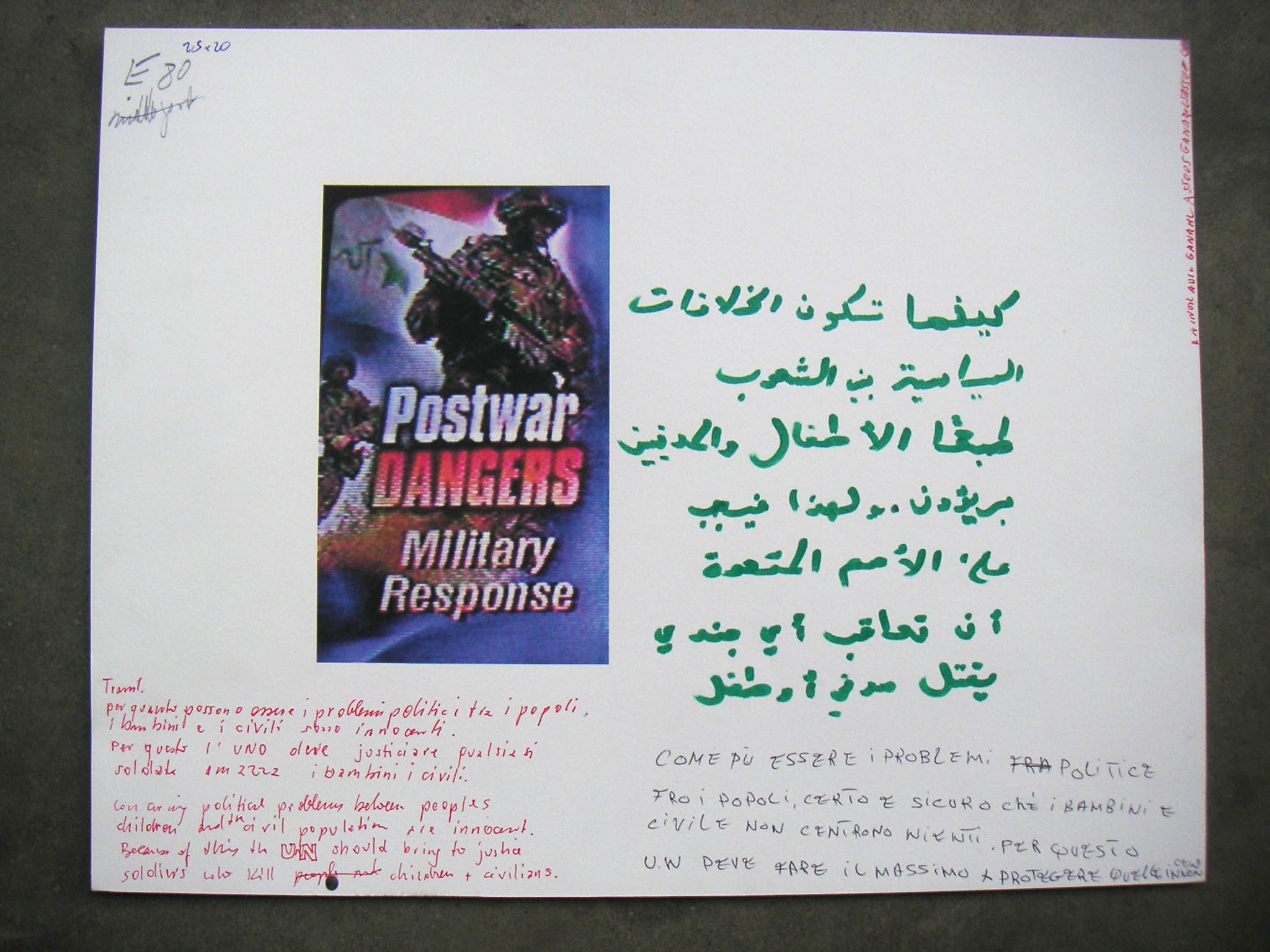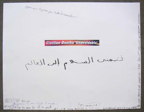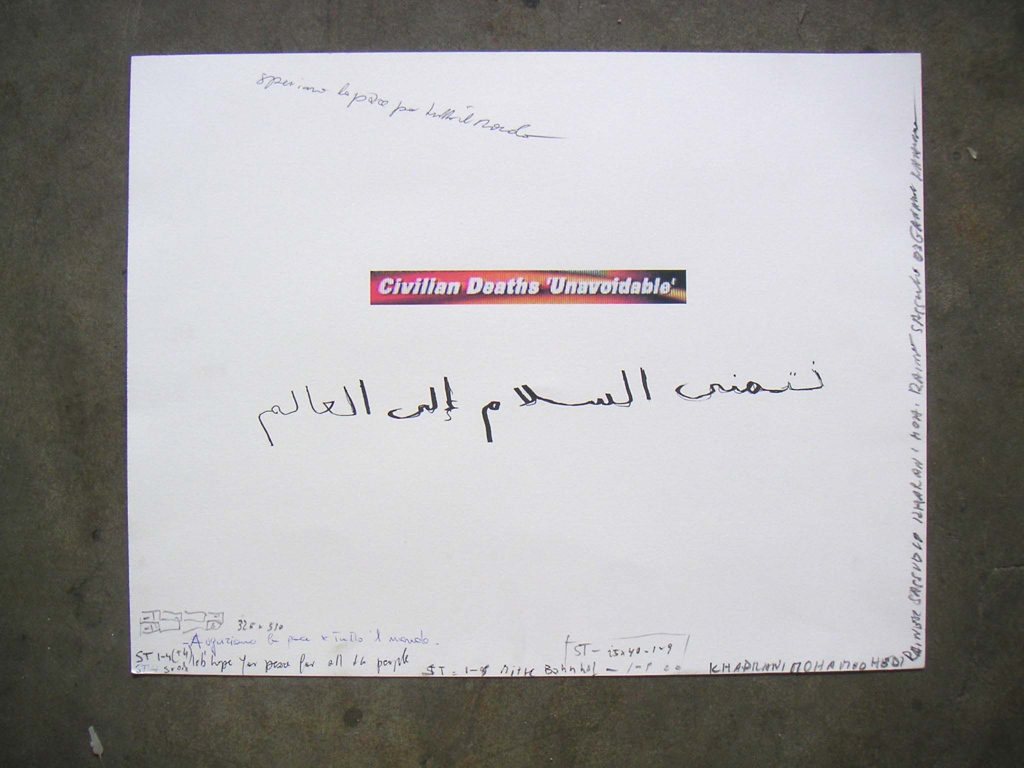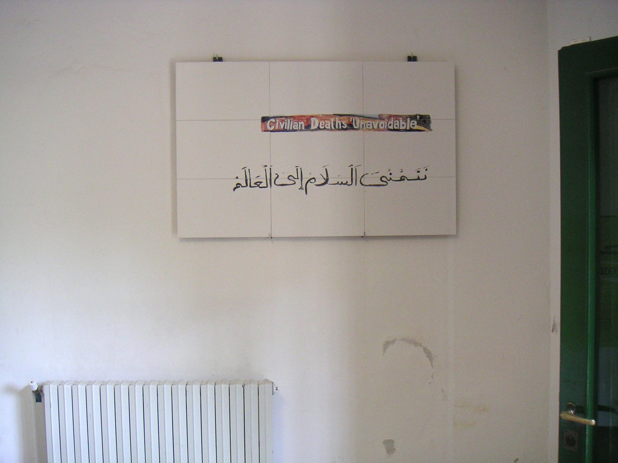 Rainer Ganahl ARAB DIALOG WITH KHADRANI MOHAMED HEDI, CIVILIAN DEATH UNAVOIDABLE, 2003 Arabic text: KHADRANI MOHAMED HEDI; calligraphy: Siyam Mohsen; graphics: Silvano Rutigliano Production: Amaze, Milano with the generous help of Forme 2000, Sassuolo and VIVA, Sassuolo. Translation by Siyam Mohsen: I hope for peace for everybody. Size: 75 cm x 120 cm x 1 cm materials: ceramic tiles: 12 individual pieces of 25 x 40 x 1 cm, certificate of authenticity photo: Rainer Ganahl Hhadrani Mohamed Hedi works in a ceramic factory in Sassuolo and is from Tunesia. (ST)