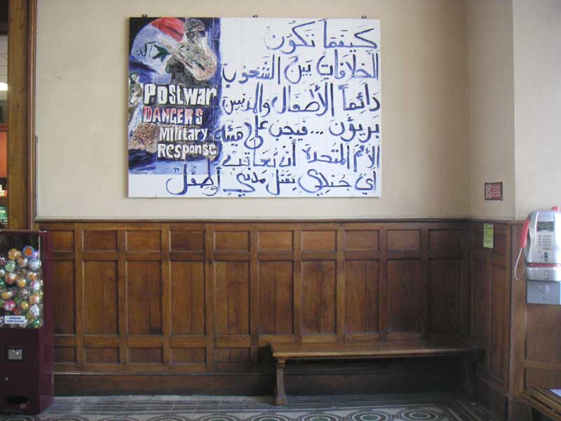 Rainer Ganahl ARAB DIALOG WITH ADIL ASSOUSS, POSTWAR DANGERS, MILITARY RESPONSE, 2003 Arabic text, calligraphy and graphics: Siyam Mohsen Production: Amaze, Milano with the generous help of Forme 2000, Sassuolo and VIVA, Sassuolo. Translation by Siyam Mohsen: With political problems between peoples, children and civil populations are innocent. Because of this reason the UN (United Nations) should bring to justice soldiers who kill children and civilians. Size: 160 cm x 250 cm x 1 cm materials: ceramic tiles: 80 individual pieces, certificate of authenticity photo: Rainer Ganahl
