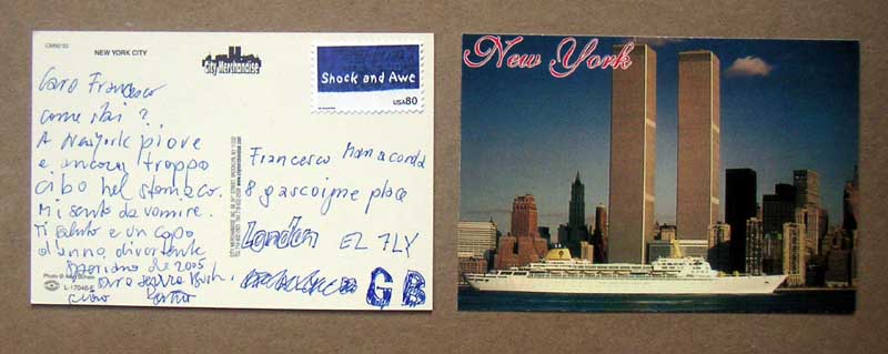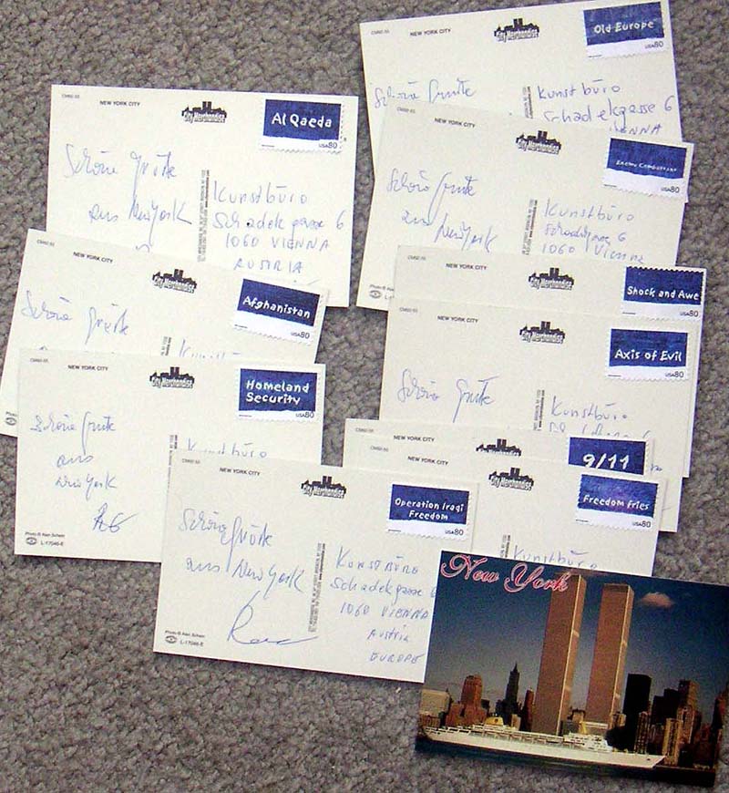 postcards sent to KUNSTBUERO, vienna -0 where I m currently havng a show.. saying: schoene gruesse aus new york. (happy greetings from New York_) MOST CARDS WERE ACCEPTED AND DELIVERED BY US AND AUSTRIAN POSTMASTERS